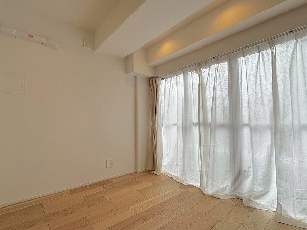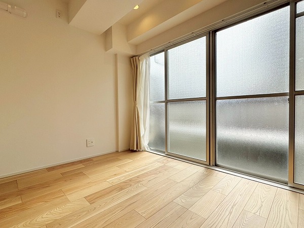 南向きの約5.0帖洋室は、すりガラスの大きな窓から優しい光がたっぷり差し込み、明るく心地よい空間。カーテンを開けても外からの視線を気にする必要がなく、日中は電気をつけずに快適に過ごせますよ。