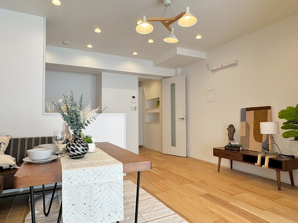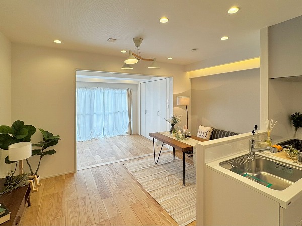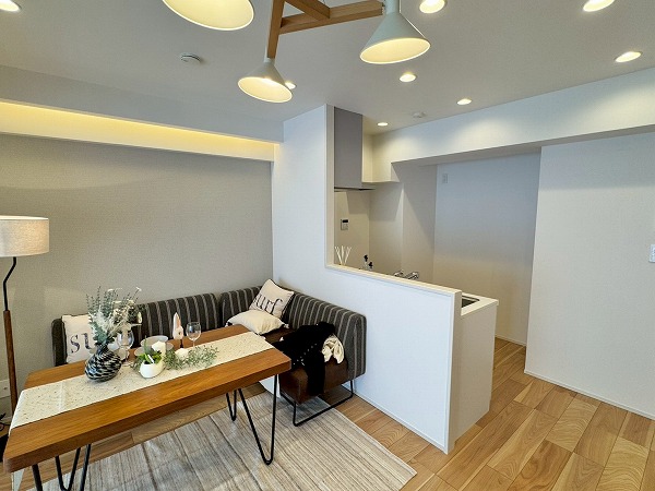 明るいカラーのフローリングで、柔らかく落ち着いたメインルーム。高く設けられた天井にはダウンライトが備え付けられており、空間をすっきりと見せてくれます。キッチン越しに会話を楽しめ、ライトの光でさらに明るく快適な空間ですよ♪
