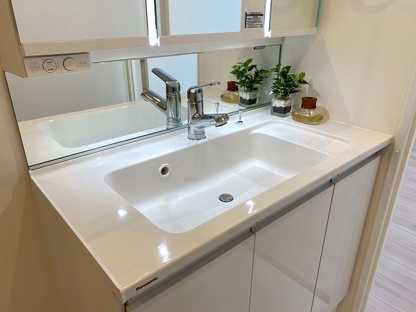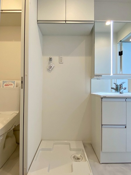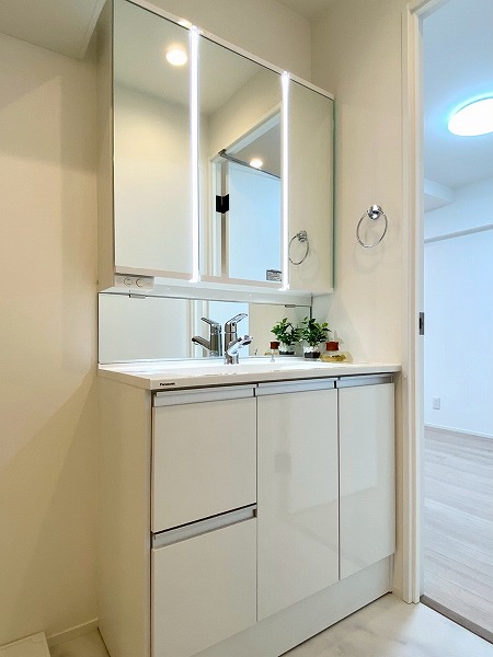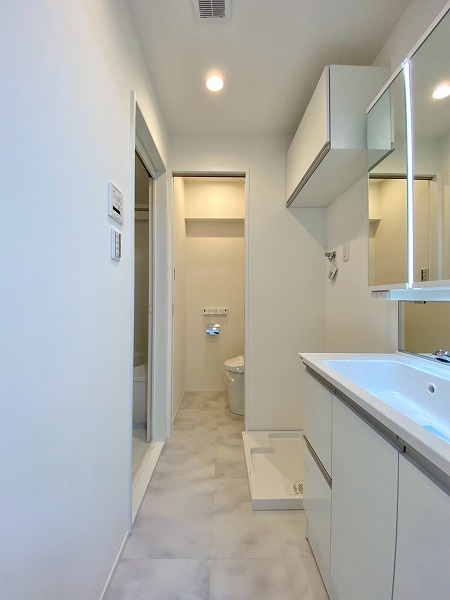 機能性と快適さを兼ね備えたサニタリースペース。洗面台・ランドリー・バスルームが1ヵ所に集約され、動線が短く済み使い勝手は抜群◎ホワイトトーンで統一された明るい雰囲気が魅力です。