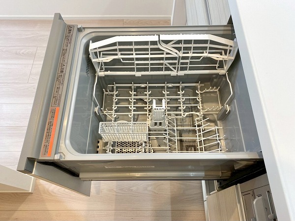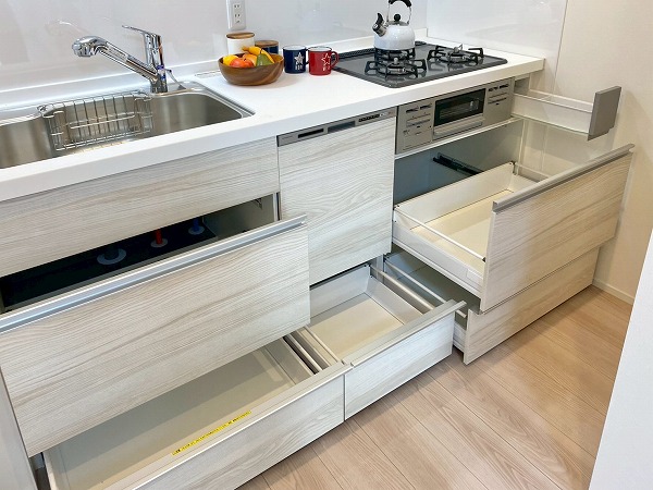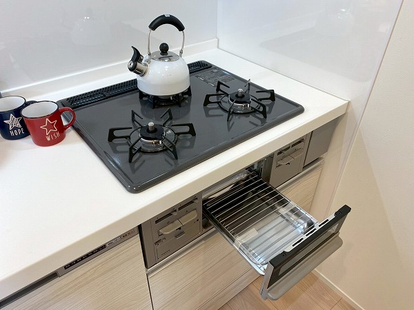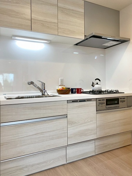 スタイリッシュな壁付けキッチンは、調理に集中できる配置。3口コンロにグリル、さらには食洗機も備わり、忙しい毎日の時短をサポートしてくれます。すっきりとしたデザインでお掃除もラクラクです♪