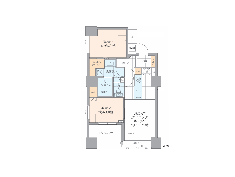 内装のデザインはとてもシンプルで、どのような色味の家具でも合わせやすそうです。両サイドの壁に余計な建具や凹凸がないのも嬉しいポイント。テレビやラックなど大きな物の設置場所に困りません。