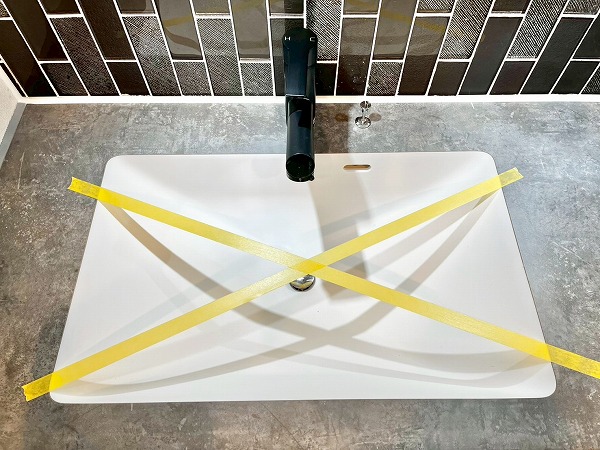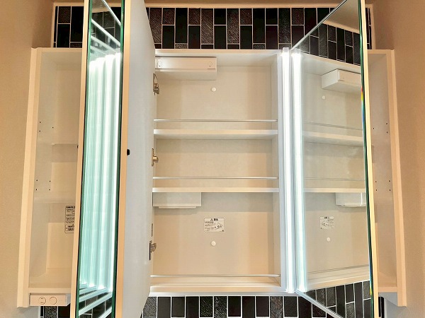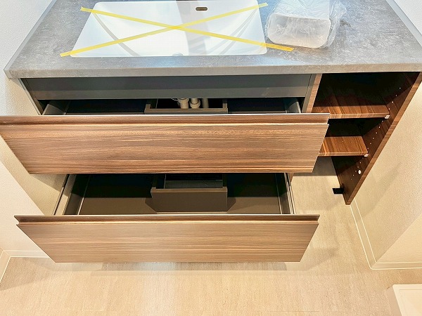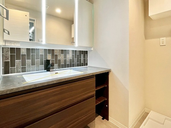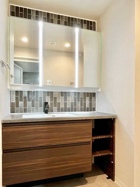 洗面化粧台はグレータイル×ダークブラウンの組み合わせがデザイナーホテルのよう。パウダールームに洗練した印象をもたらしています。ワークトップがかなり広めで、ハンドソープの他にケア用品を並べたり、インテリア用の緑を置いたりすることもできそうだなと感じました。鏡はワイドに作られており、背が高めの方でも見切れる心配はなさそうです。
