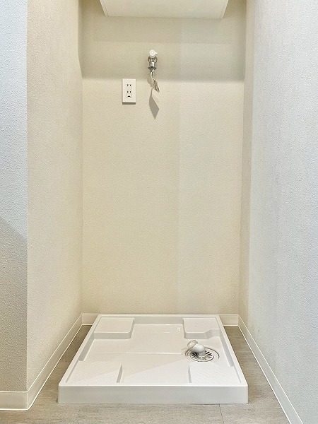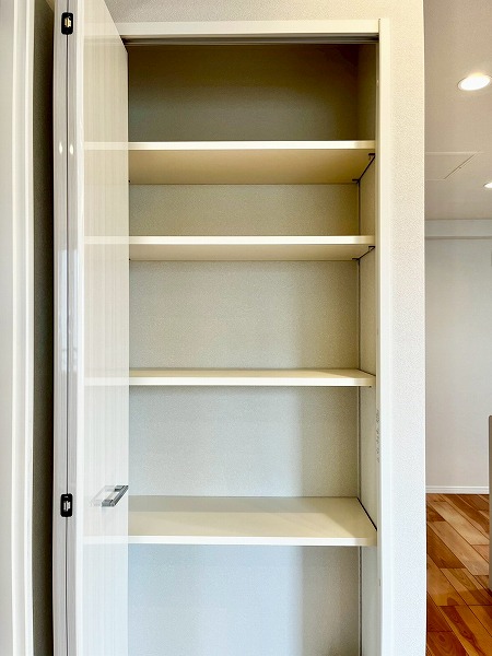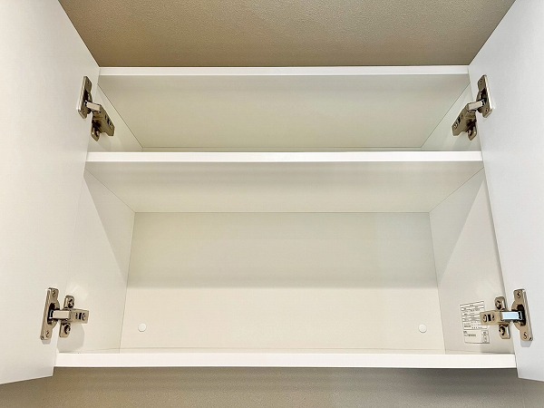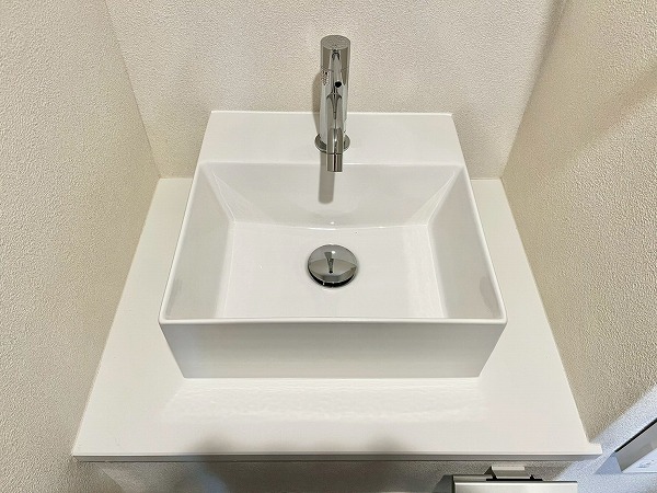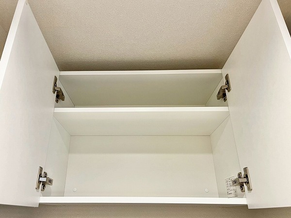 ホワイトで統一されたシンプルなトイレ。タンクレスタイプを採用し、さらにスタイリッシュな空間に仕上がっています。トイレ内には専用の洗面カウンターが付き、すぐに手を洗えて衛生的ですね。上部に扉付きシェルフを設けており、ペーパーやお掃除グッズを見せずに収納できます。メインルームからアクセスしやすい位置にあるのもグッドポイントです◎