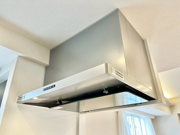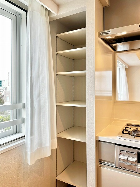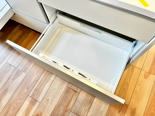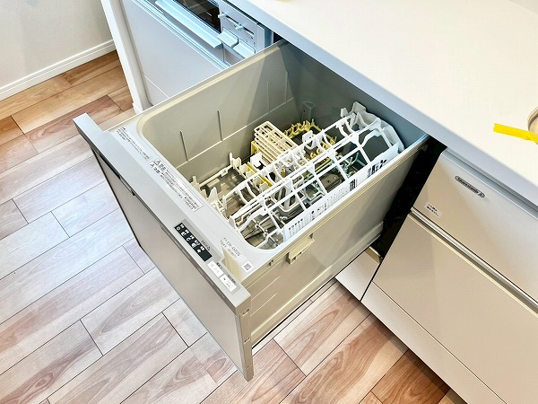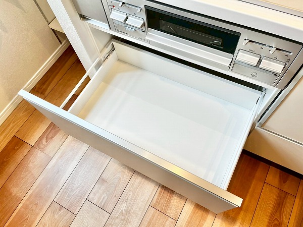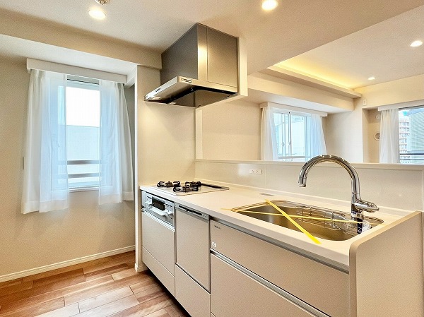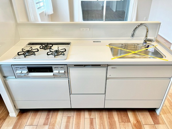 3口コンロ・食洗機を搭載した対面式のオープンキッチン。採光窓によって明るさが確保され、気持ちも軽やかにお料理を楽しめます。ダイニング側からは調理の手元が隠れるようになっており、友人を招いた際などでも生活感を上手に隠してくれる造りです、コンロ脇のシェルフにはミトンや調味料などを置けば、加熱調理が快適に◎