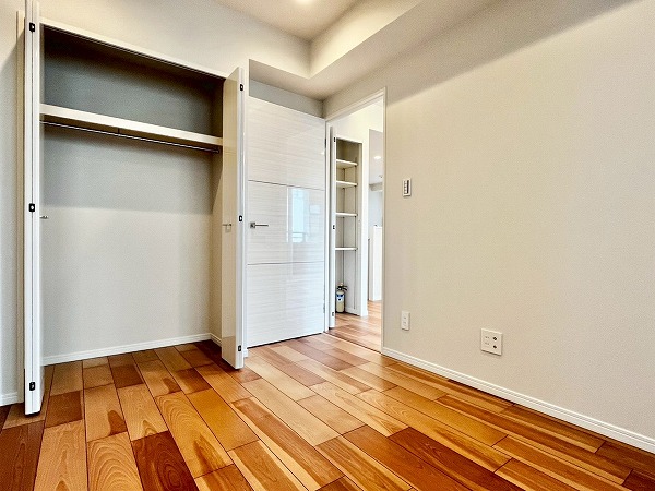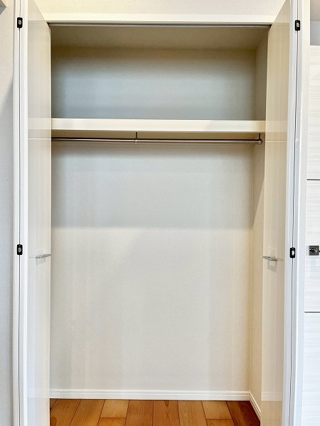 洋室内のウォークインクローゼット。こちらもお部屋と同じようにやや変則的な形をしています。そのおかげでお洋服が重なりにくく、よく見えるような造りになっているなと感じました。扉がスライド式ではなくドアタイプなのがポイントで、ドア開閉時の音が最小限に抑えられます。