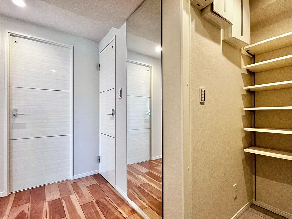 玄関扉を入るとまず大きな鏡が目を引きます。狭さを感じがちな廊下に広がりを生む効果が◎右手には大容量のシューズインクローゼットを設置。玄関ポーチとシームレスに繋がっており、土足のまま出入りできるので、室内へ持ちこむのはためらわれるアウトドア用品の置き場所・大切なシューズをボックスのまま保管しておくのにぴったりです。