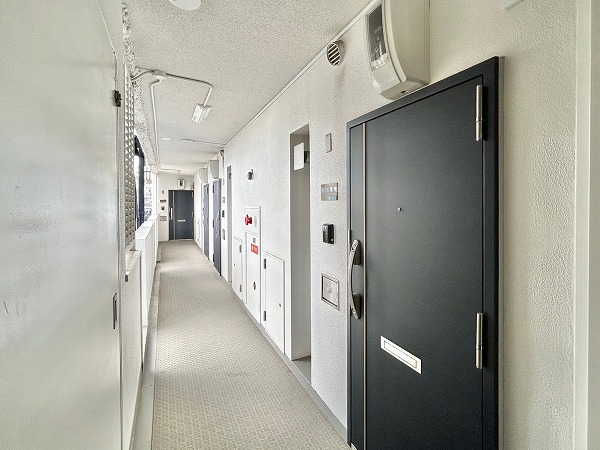 居住フロアは通気性に優れた外廊下仕様。屋上に上がる事もできて、洗濯物を干す事が出来るみたいです。玄関ドアとサッシが改修されているため、築古マンションながら快適にお過ごしいただけるはず。屋上には物干し場も設けられていました。新宿の街を一望しながらお洗濯物を干すことができる贅沢な空間です。