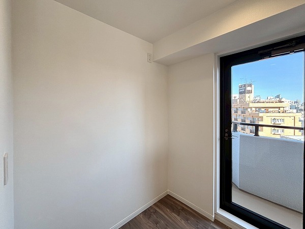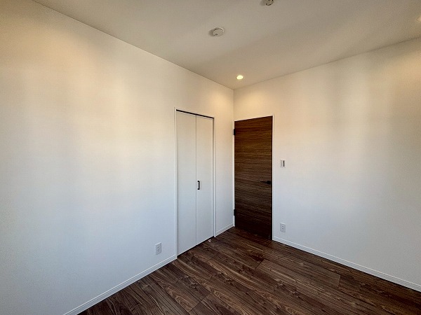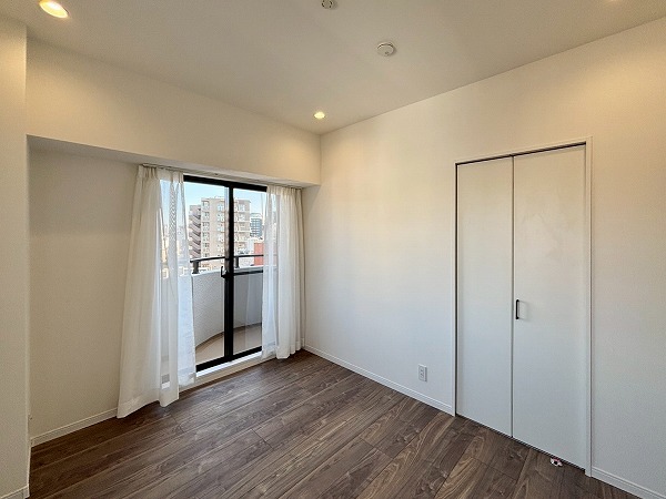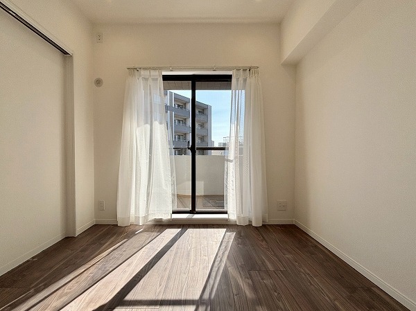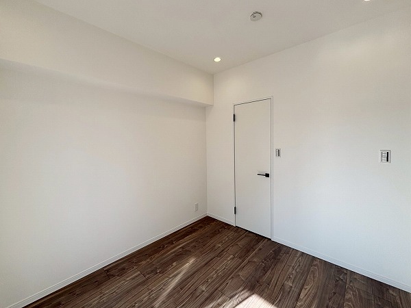 玄関左手に位置する1つ目の洋室は、6帖ほどの広さです。こちらもメインルーム同様2面に窓があってのびのび過ごせそう◎クイーンサイズのベッドも設置できるので、ご夫婦で使用する主寝室にピッタリですね。