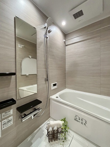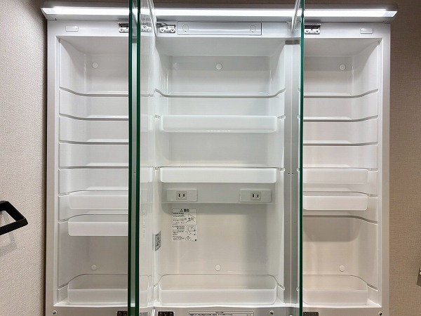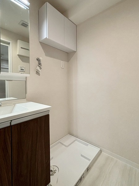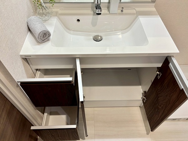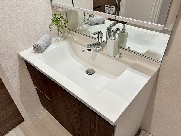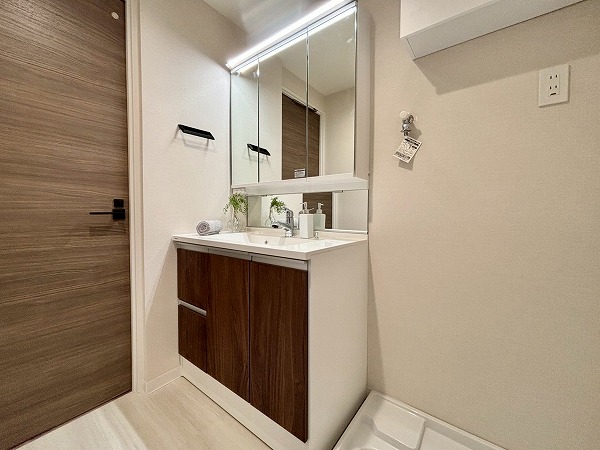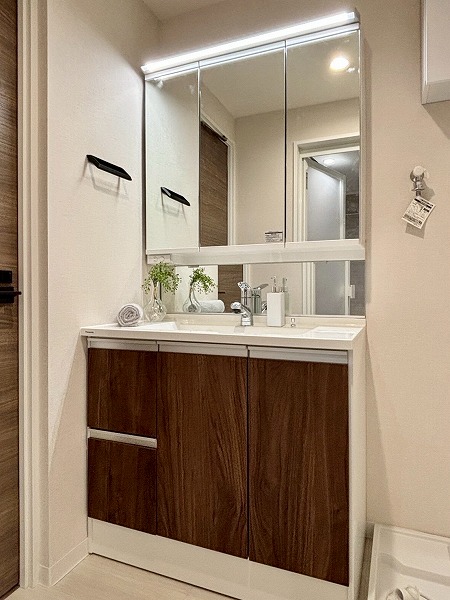 ホワイト×ブラウンを基調にした、落ちついた雰囲気のサニタリールーム。水回りがまとまっているので動線が良く、お掃除やお洗濯などの家事がしやすいですよ。洗面化粧台はミラーキャビネットの下にミドルミラーがあって、屈んだ状態でもお顔の様子を確認できます。