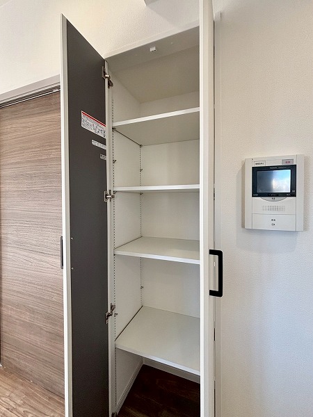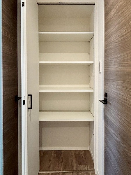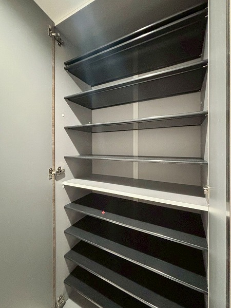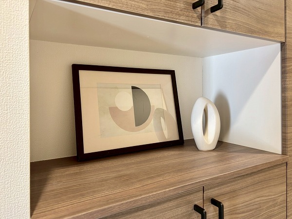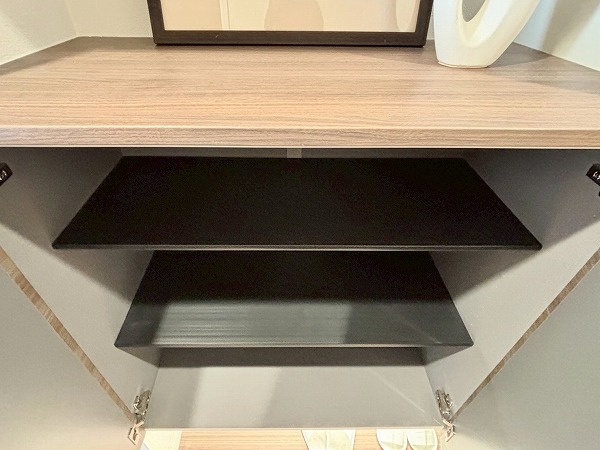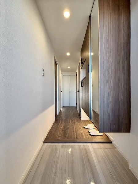 防犯性の高いツーロックドアを開けると、広々とした玄関が現れます。フロートタイプのシューズボックスが開放感をプラスしていますね。シューズボックスはスペースが多いので、ご家族全員分の靴をすっきりしまえます。カウンターにはフレグランスやお花などを飾ってみては。