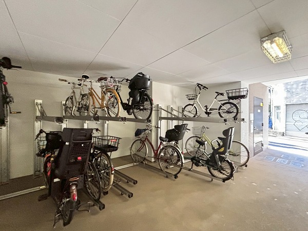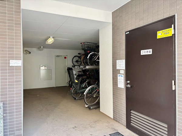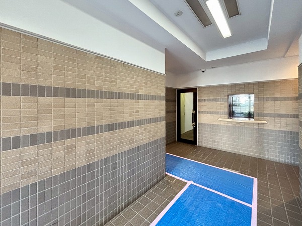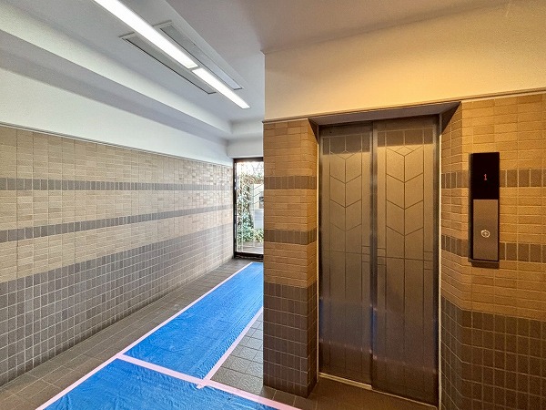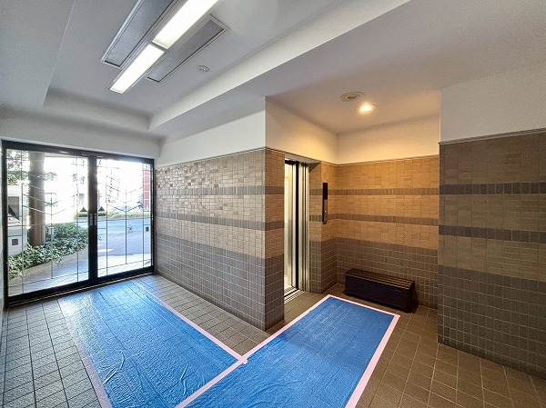 タイル貼りのエントランスホールが広がっています。エレベーターは奥まった場所にあり、マンションの外から乗り降りする様子が見えないようになっています。プライバシーが守られますね◎エレベーターを待つ間の荷物置きがあるのもポイントです。
