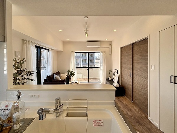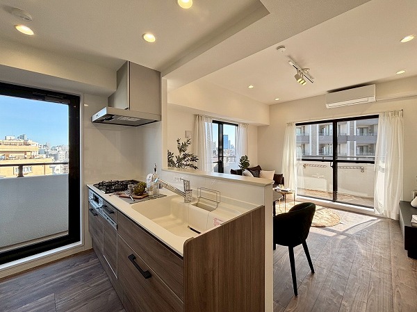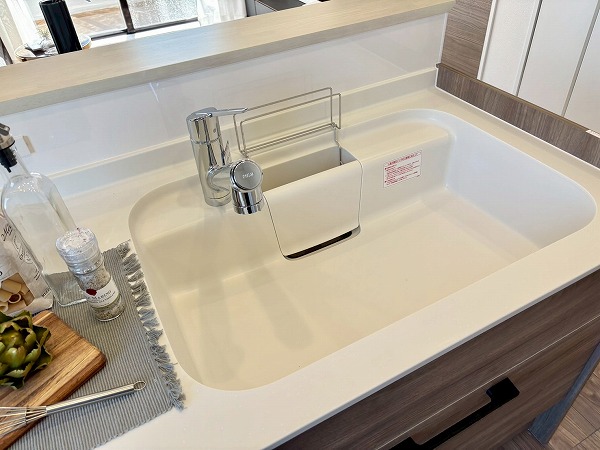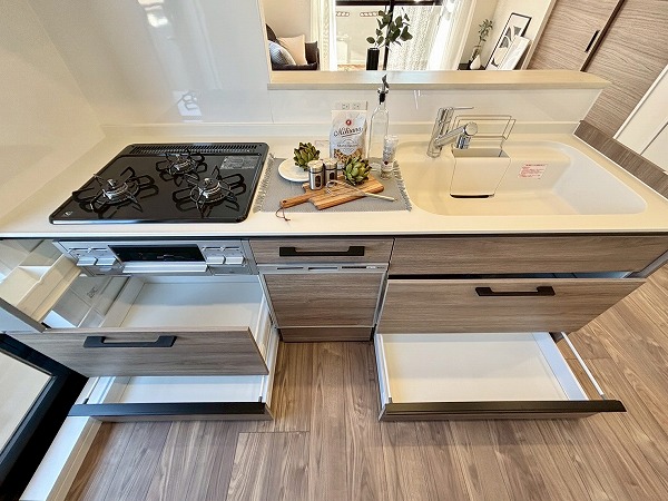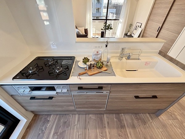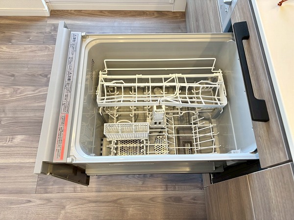 キッチンにはバルコニーへ続く窓が備わっていて、開放感がありますね。キッチンシンクは幅が広く使い勝手が良さそうです。左下にはスライドオープンタイプの食洗機が。屈まずにお皿の出し入れが行えるので、腰への負担が少ないというメリットが◎