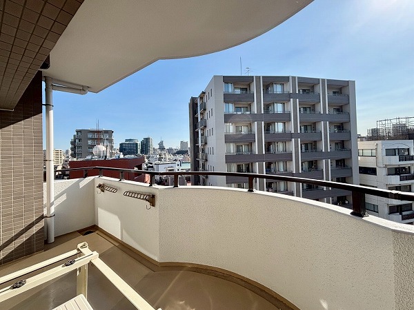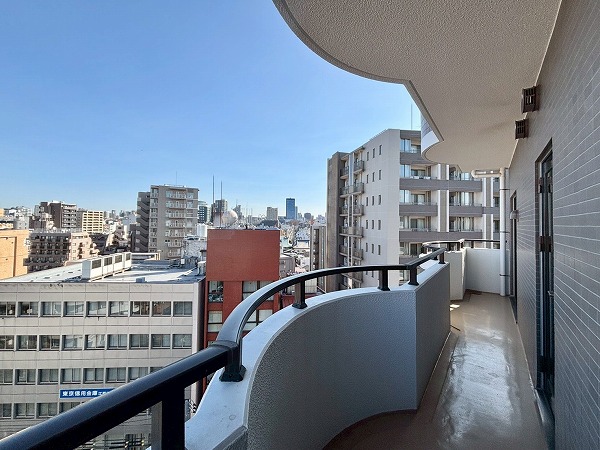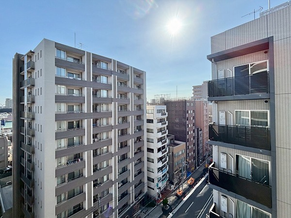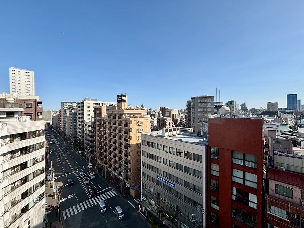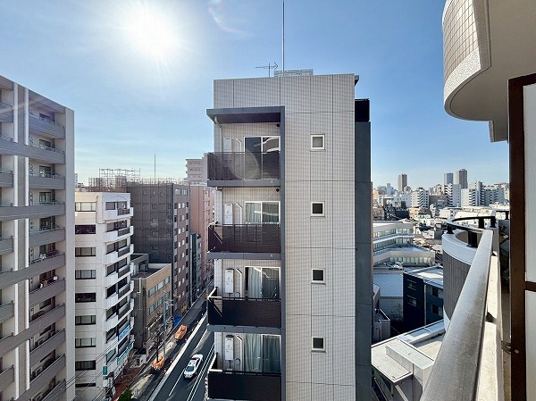 今回の2LDKは南東側と北東側の2面に窓があります。大通りに挟まれた立地なので周囲が開けていて、見晴らしの良い景色をお楽しみいただけますよ。陽当たりが良いので、お洗濯物は良く乾きそうですね。10階のお部屋なので、車の走行音は想像よりも気になりません。