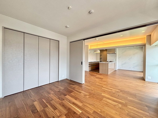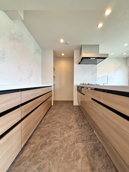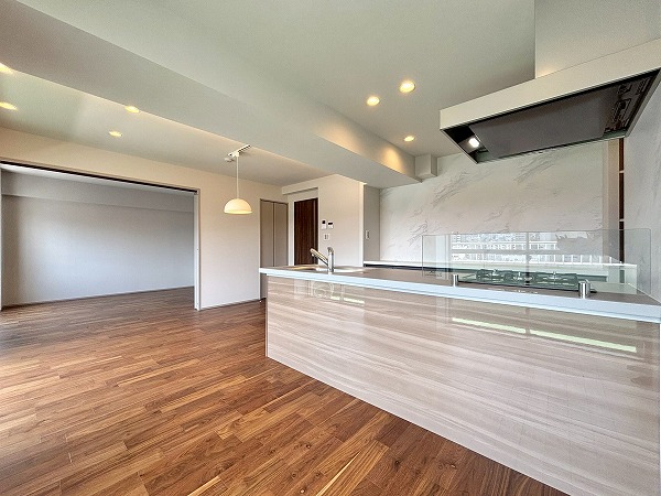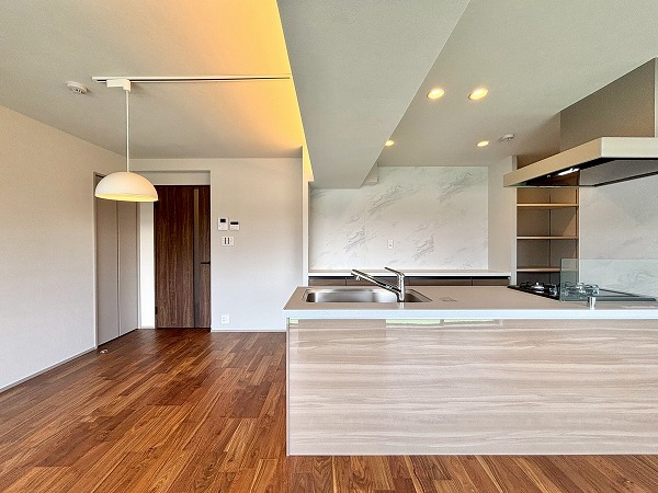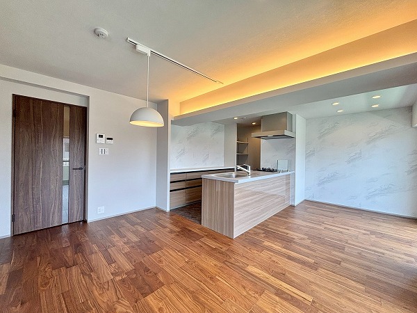大理石調のアクセントウォールと深みある木目が調和した約16.2帖のメインルーム。間接照明により、空間全体に柔らかなぬくもりが広がります。天井のライティングレールで光の表情を自在にアレンジ可能✧