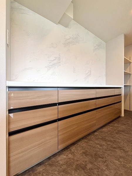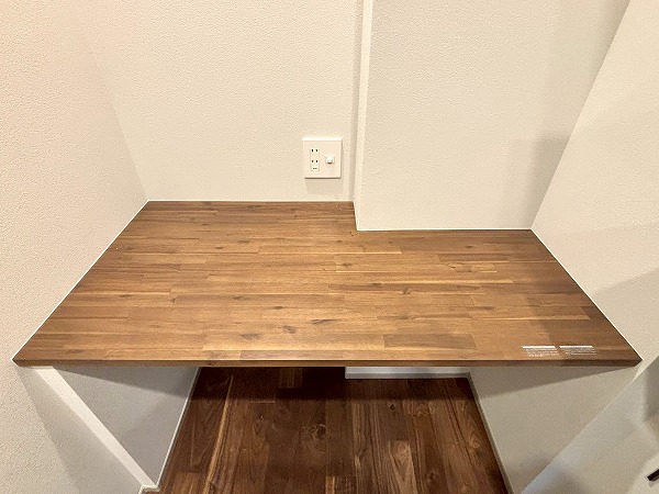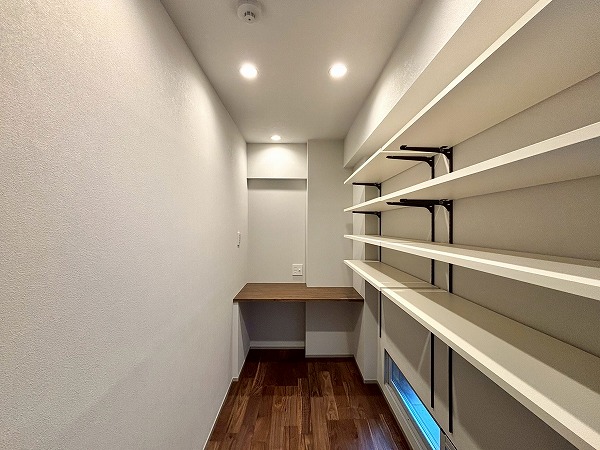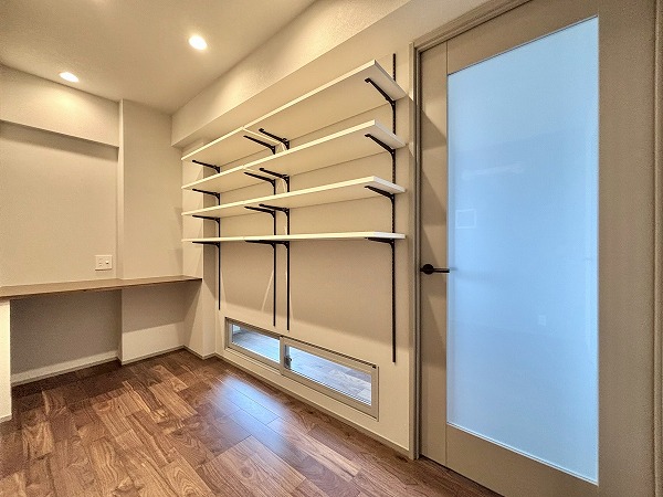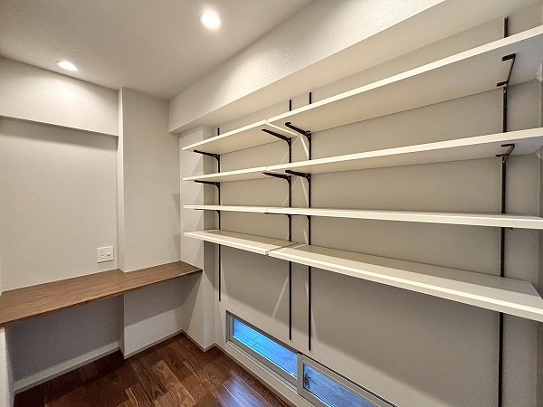 約6.7帖の洋室には作業スペースとして便利な書斎をプランニング。カウンターと可動棚で収納力も申し分ありません。仕事にも趣味にも集中できる、過ごしやすいパーソナルエリアです◎