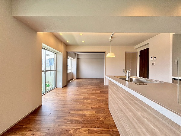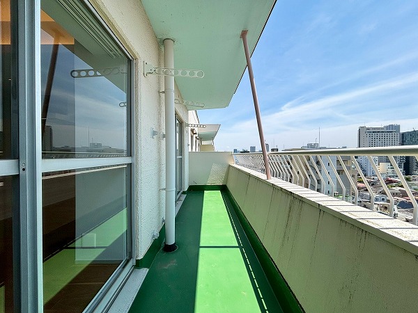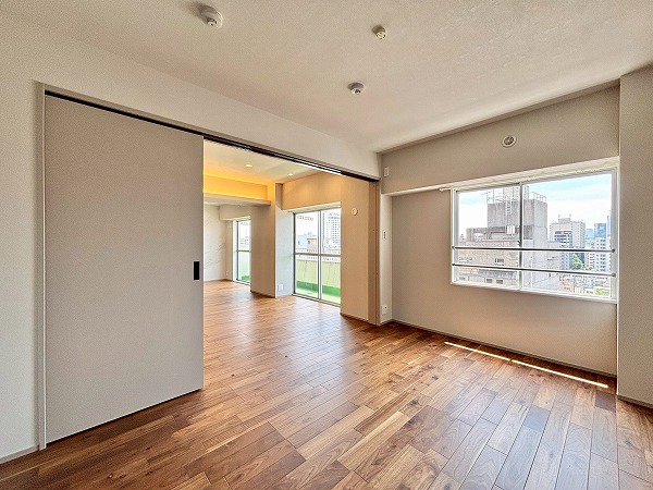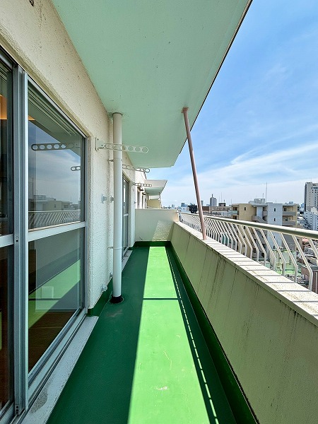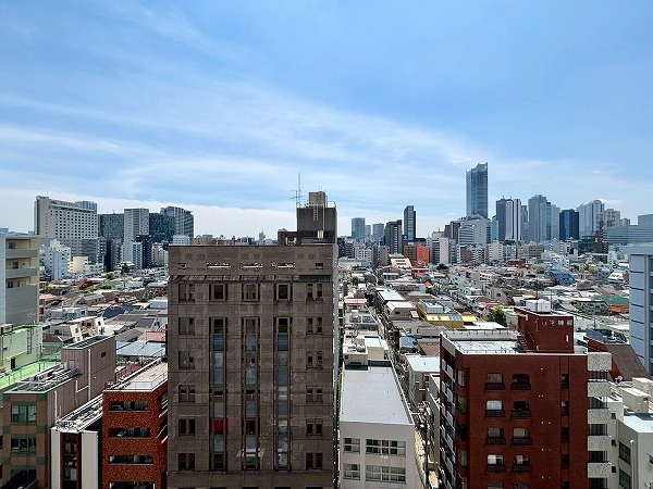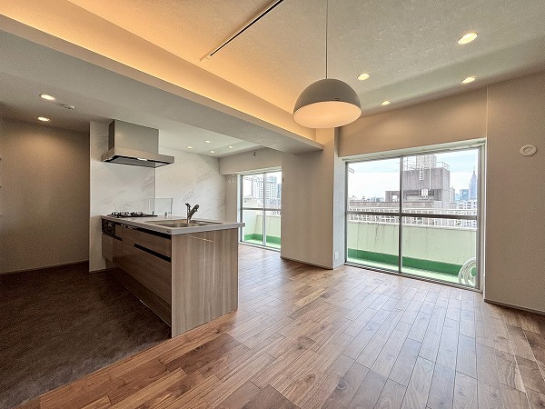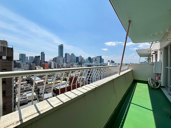 南向きの13階住戸につき、バルコニーに出れば陽光を身近に感じられます。温かな光がメインルームまで届き、心地よい空気感に☀夕暮れ以降は新宿のネオンが美しく浮かび上がる夜景を堪能できますよ。
