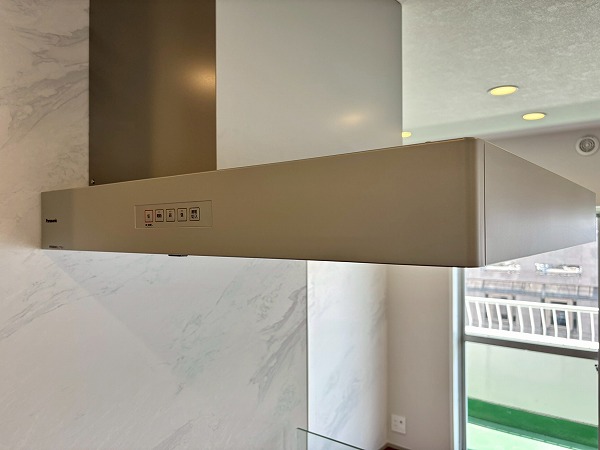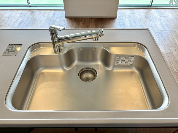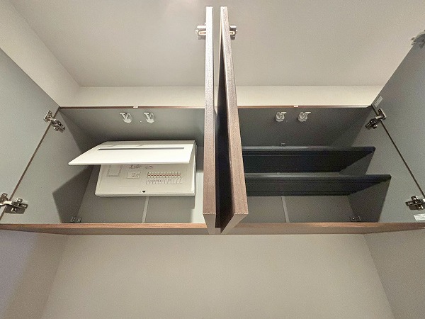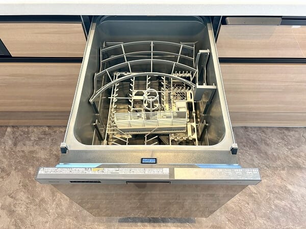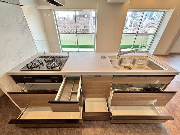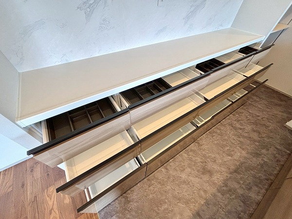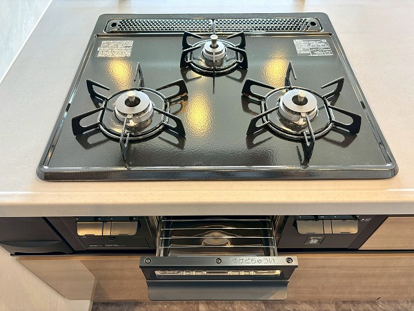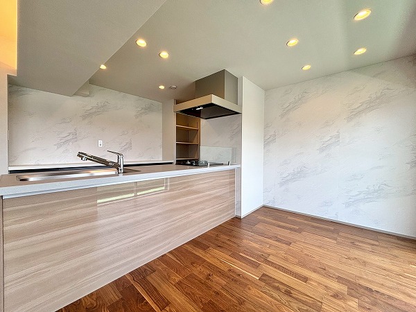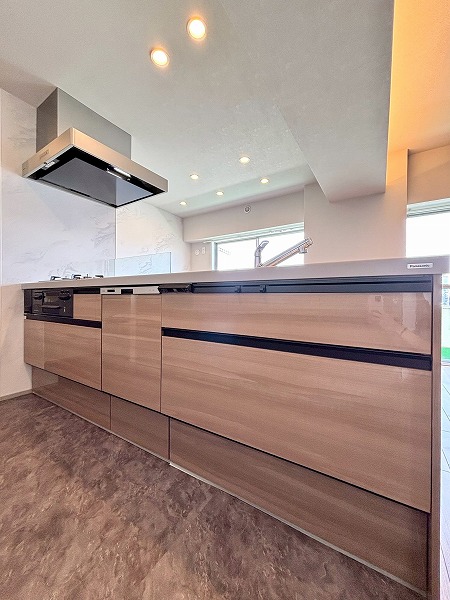 リビングに向かった対面式キッチンは温かみのある木目デザイン。家族と会話を楽しみながら調理できる点が魅力です。背面には収納力に優れたカップボードが備わり、日々の片付けもスムーズ♪