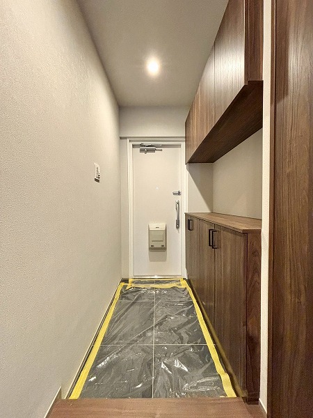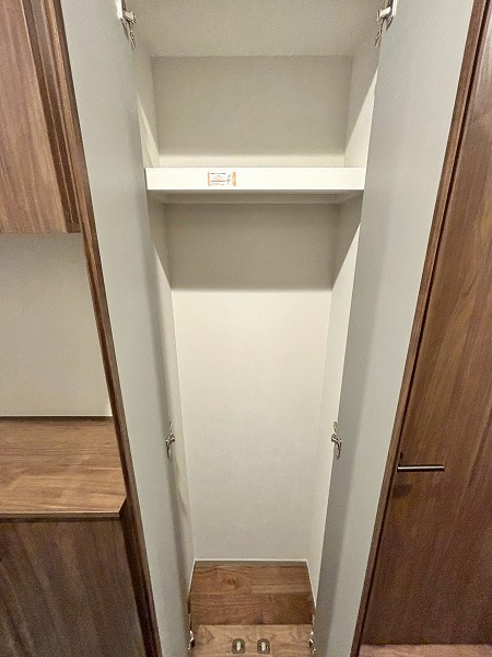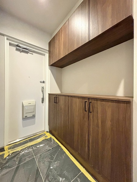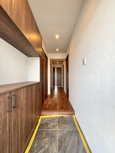 玄関に入ると、木のあたたかみと落ち着いた色合いがやさしく出迎えます。シューズボックス横にも収納スペースがあり、生活感を見せずにすっきり整えられる点が魅力です✿