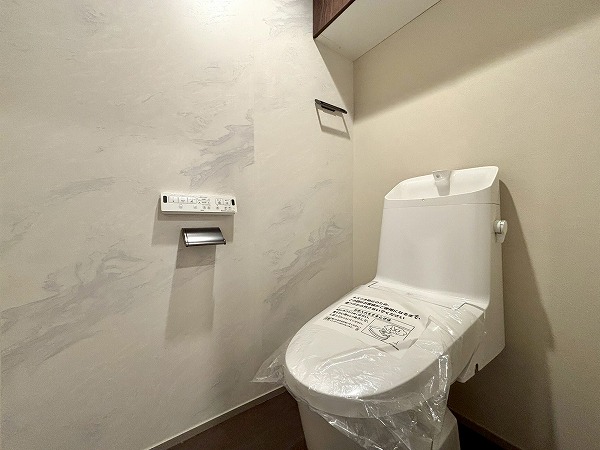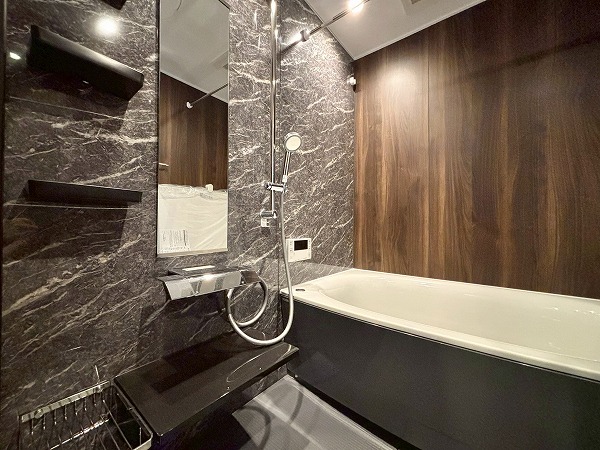 上品な大理石調×ウッド調が印象的な浴室。ゆとりある浴槽でゆったり入浴が叶います♡追い焚きでいつでも心地よい湯温をキープでき、浴室乾燥で天候に左右されず洗濯可能。