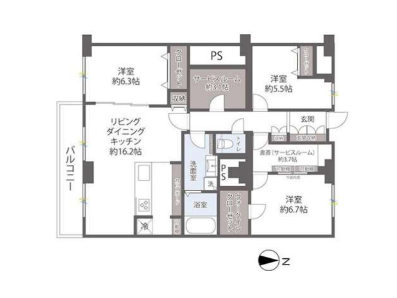 約3.1帖のサービスルームは、収納としてはもちろん、着替えスペースや作業部屋にも使えるマルチルーム。ハンガーパイプ完備で衣類をたっぷりしまえる頼もしい空間です✧