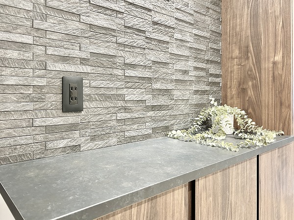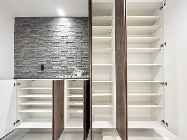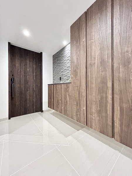 タイル貼りの玄関は高級感がありますよね。壁面にはざらりとしたタイルが用いられ、グッと洗練された雰囲気に仕上がっています。土間が広く、ベビーカーやスーツケースを一時的に置いておくことができますね。大きなシューズボックスに加えてシューズインクローゼットが備わっています。ご家族全員分の靴をスッキリ整頓できますよ。