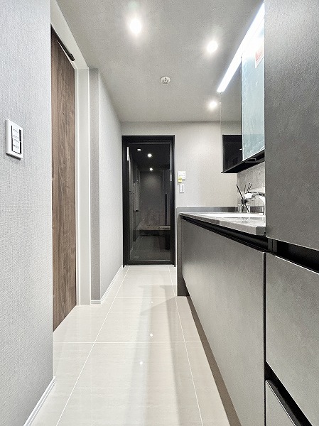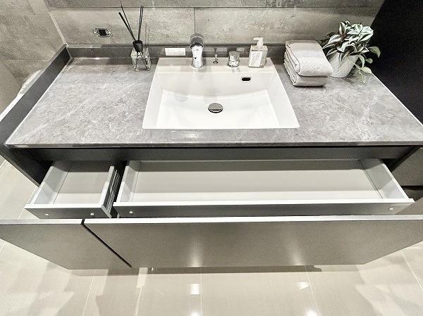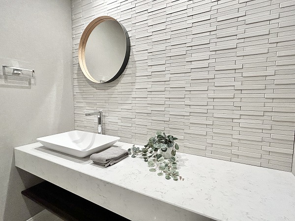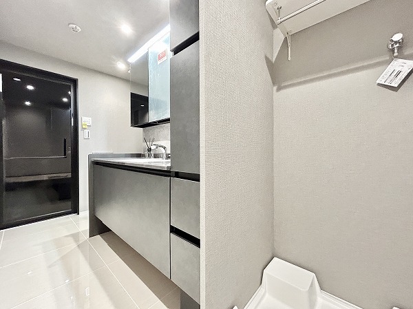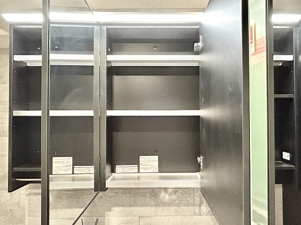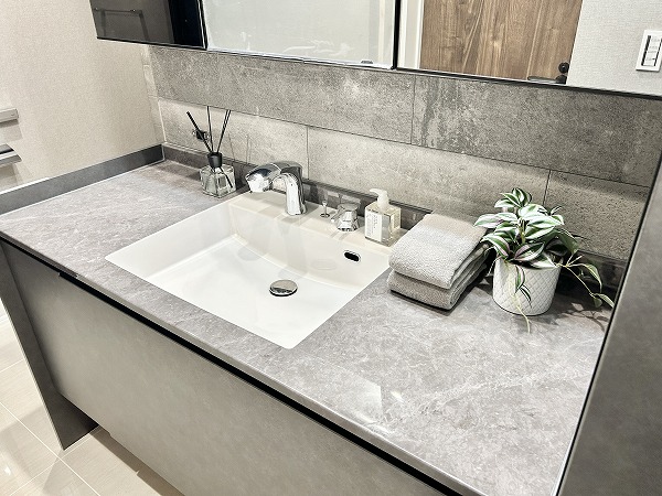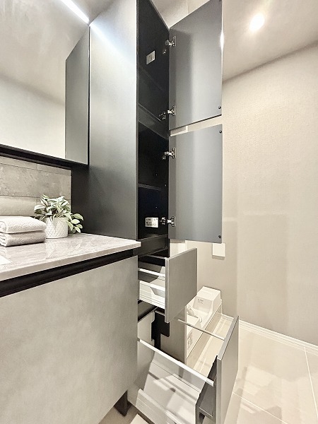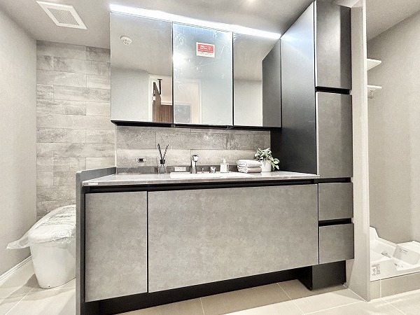 グレーとホワイトを基調としたモノトーン調のサニタリールーム。3面鏡の洗面化粧台なら、鏡の角度を変えてお顔や髪型をしっかりチェックできます。メイクやヘアセットをスムーズに行えるはず。ミラーキャビネットや台下収納に加えて、洗面台の横にも収納が。かさばるリネン類などもスッキリ収納可能です。
