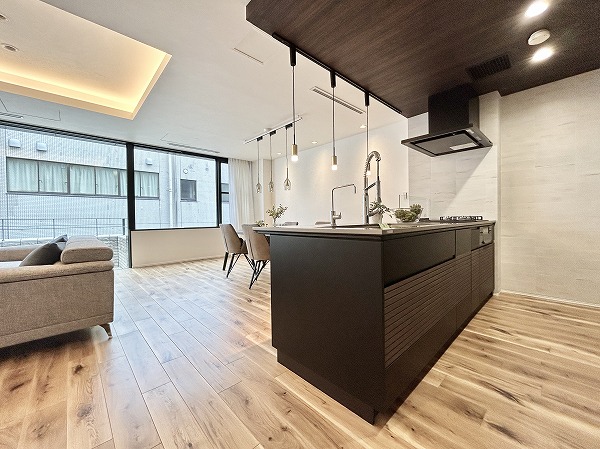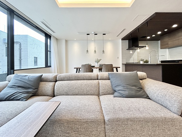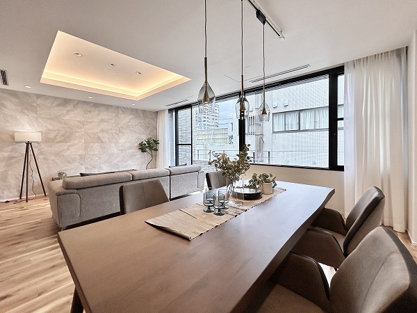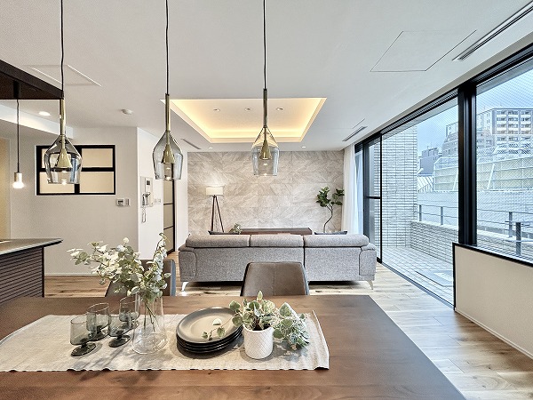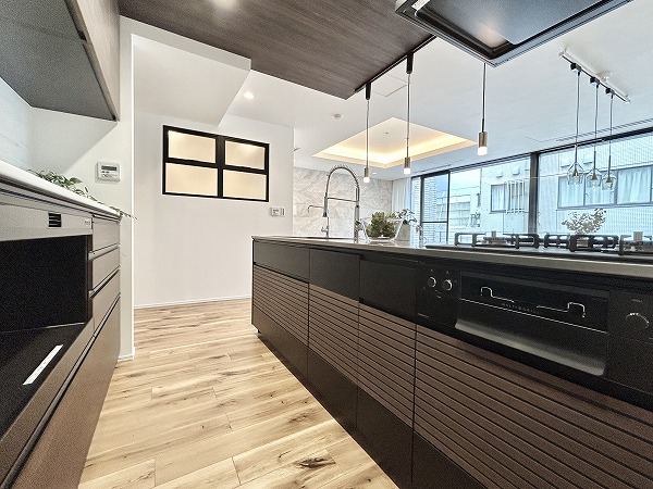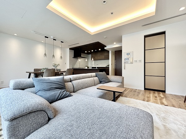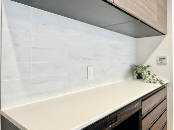 リビングダイニングキッチンは一面に窓がありとっても開放的。折り上げ天井とコーブ照明がお部屋に明るさと奥行きを齎しています。壁面にタイルが用いられ、モダンな雰囲気が漂っていますね。ゆったりした間取りなので、レイアウトの自由度が高いのも特徴です。床暖房が足元からじんわり温めてくれるので、冷え性の方も快適に過ごせるはず。