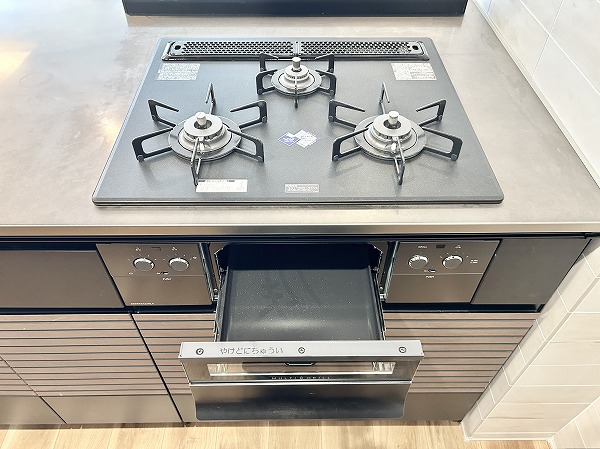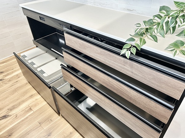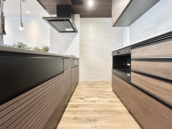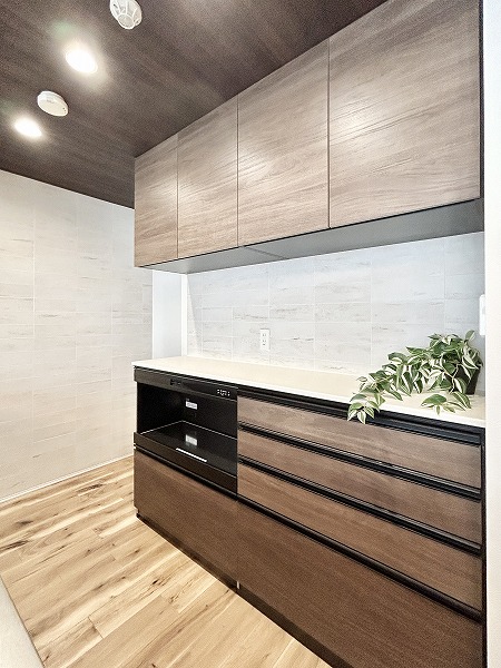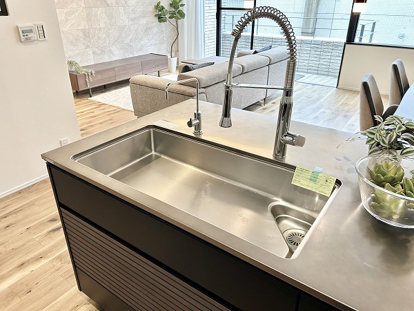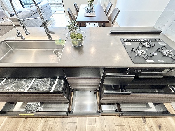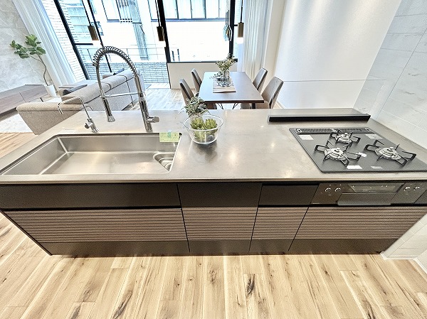 開放的なフルフラットタイプのシステムキッチンなら、お料理をしながらご家族との会話を楽しめます。キッチンにも床暖房が備わっているのは嬉しいポイントですよね。キッチンシンクには通常の水栓に加え浄水器の独立船を搭載。より浄水効果が高く、美味しいお水を手軽に楽しめます。他にも、食洗機や3口のガスコンロ、カップボードなど嬉しい魅力が満載です。◎