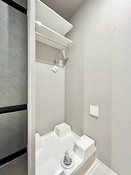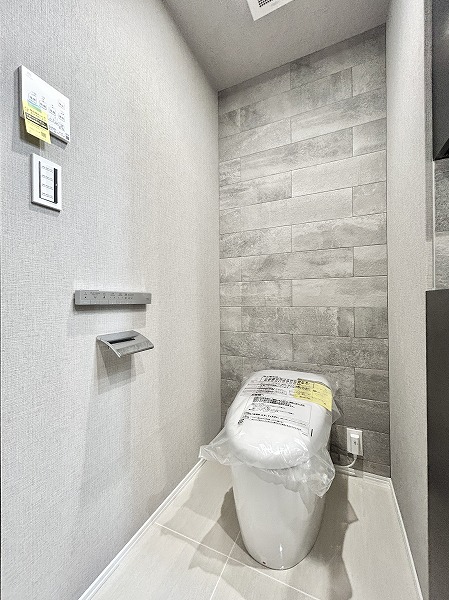 サニタリールームだけでなく、玄関横にもトイレが備わっていました。スッキリとしたデザインが人気なタンクレスタイプを採用しています。手洗い場や温水洗浄便座機能が備わっていて、お客様にも快適にご利用いただけますね。サニタリールームのトイレを日常的に使い、こちらは来客用として使い分けるのも良さそうです。