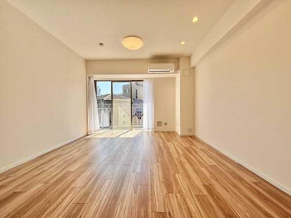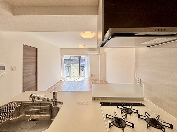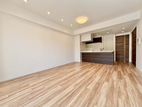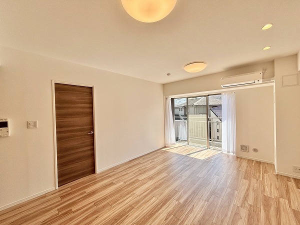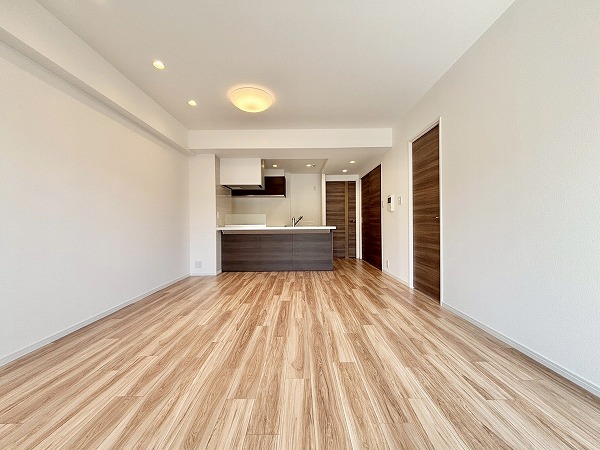 リビングダイニングキッチンはおよそ16.2帖の広々空間。南側の大きな窓から太陽の光が射し込む明るいお部屋です。家具の配置がしやすく、レイアウトを考えるのが楽しくなりますね。白い壁を利用して、プロジェクターで映画を楽しむのも良さそう。