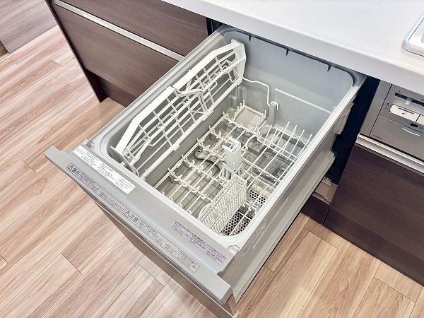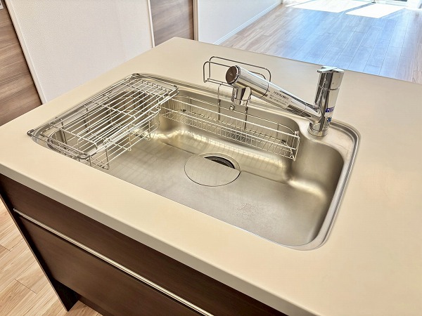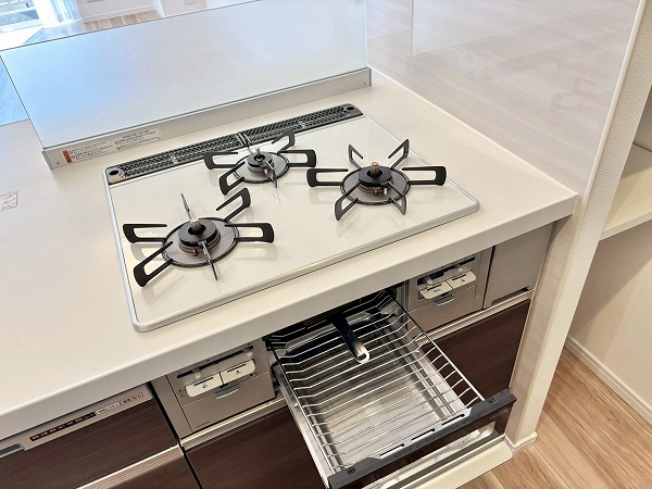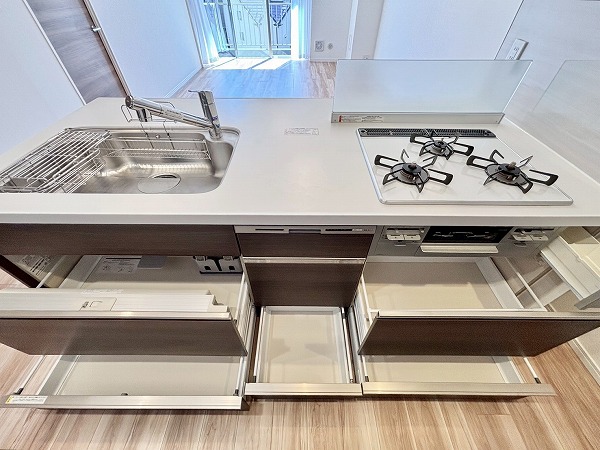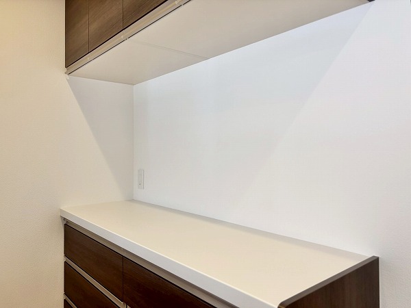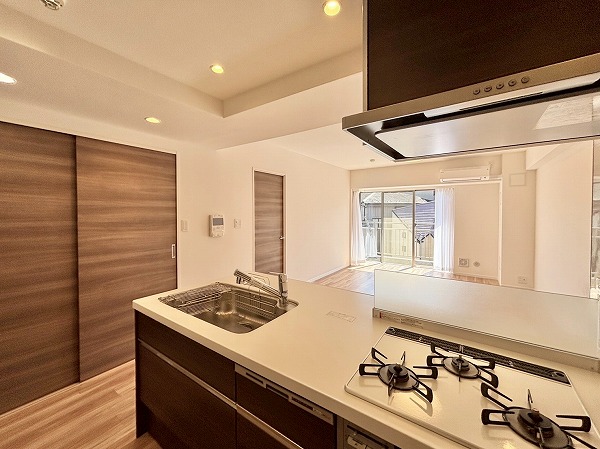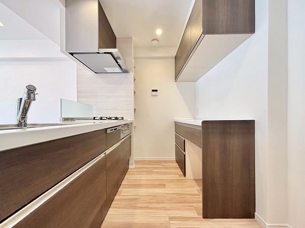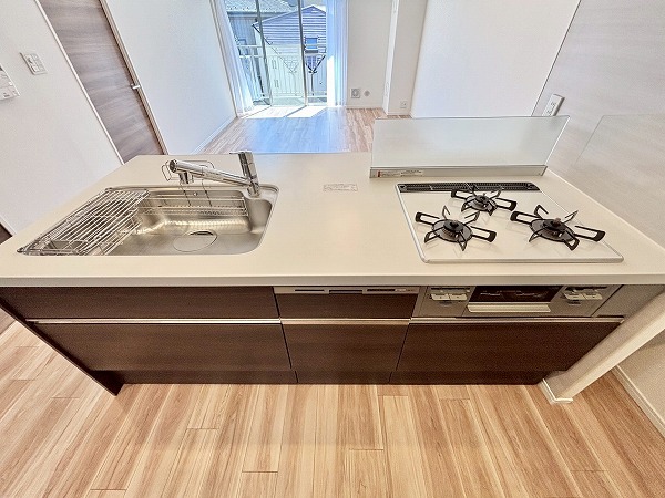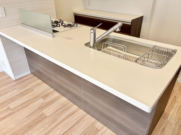 開放的なフルフラットタイプのシステムキッチンに新規交換済み。お料理をしながらご家族との会話をお楽しみいただけます。背面には大きなカップボードが。カウンター部分に家電を並べれば、お料理の動線がもっとスムーズになりますね♫