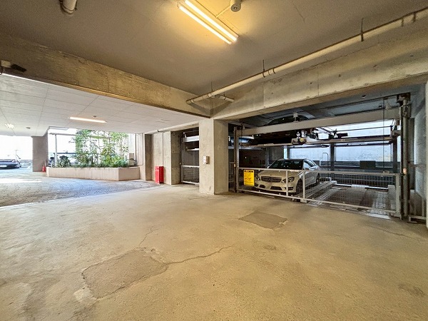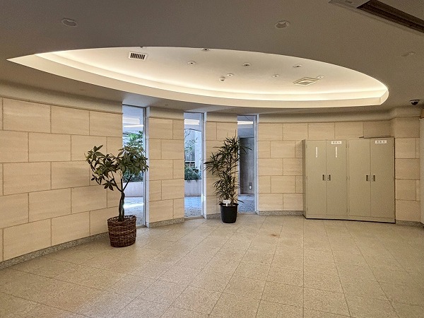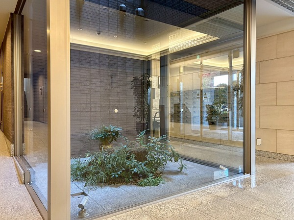 広々としたエントランスホールには坪庭が。マンション内には他にも植物が飾られていて、癒しをもたらしています。エレベーター左手の通路から、駐車場と駐輪場へ向かえるようになっていました!