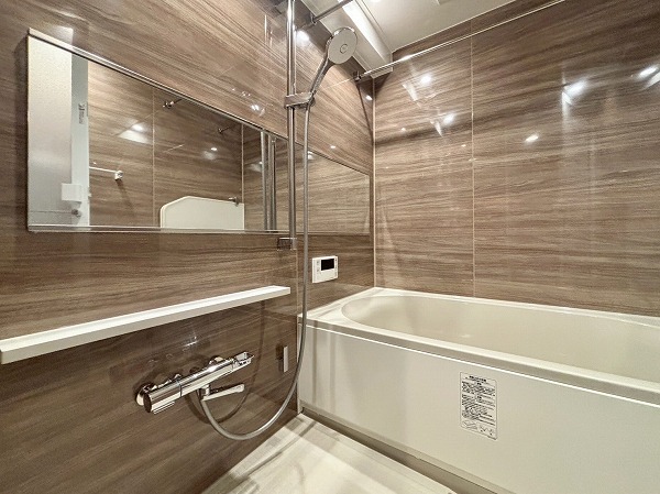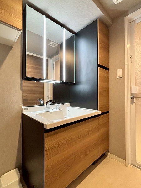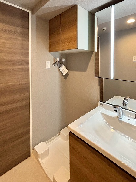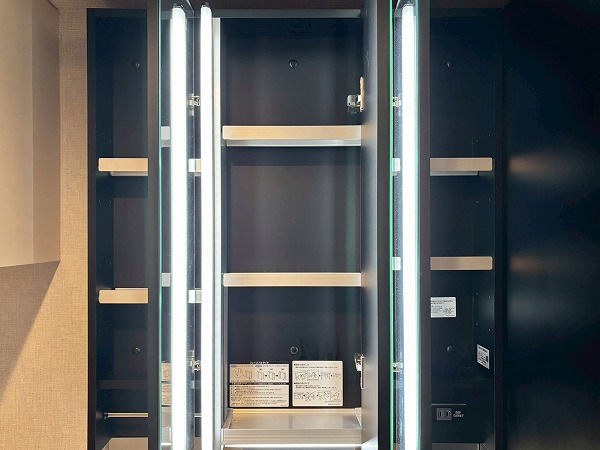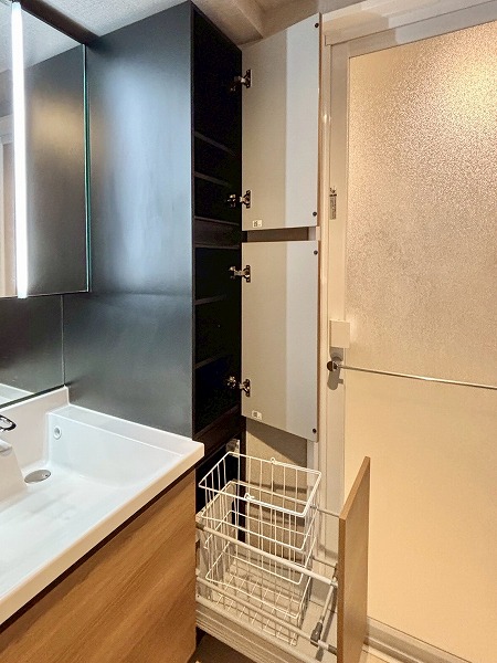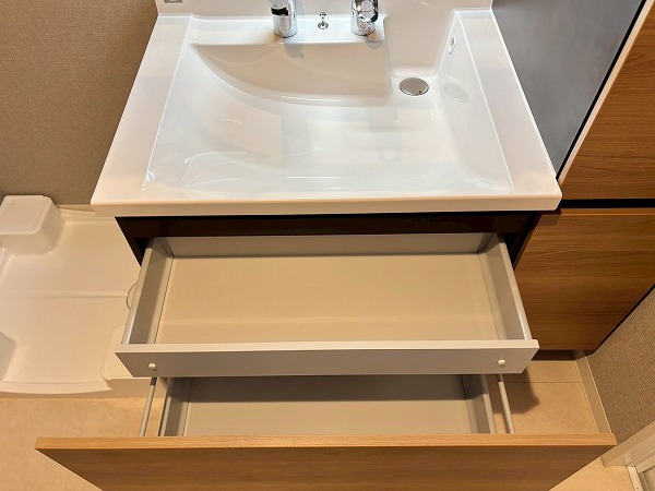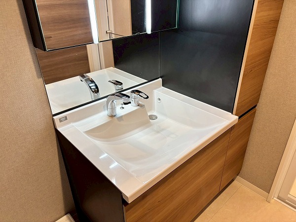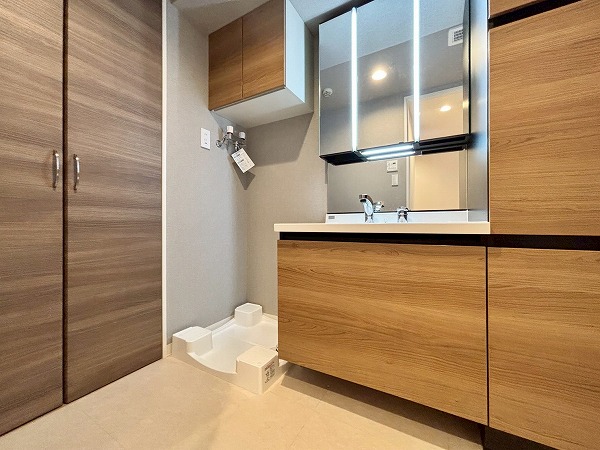 パウダールームは玄関廊下を進んで左手に。落ちついた色合いで統一されています。洗面化粧台にはミラーキャビネットと台下の引き出し、右手の引き出しの3つがあり、スキンケア用品などをすっきりしまえます。大きなリネン庫があるのも嬉しいポイント。