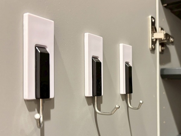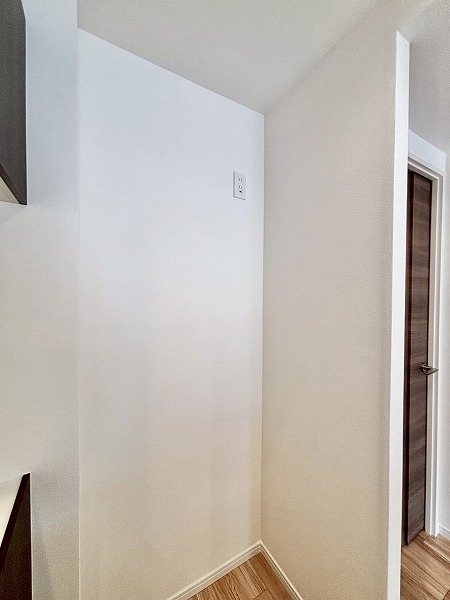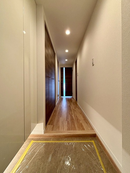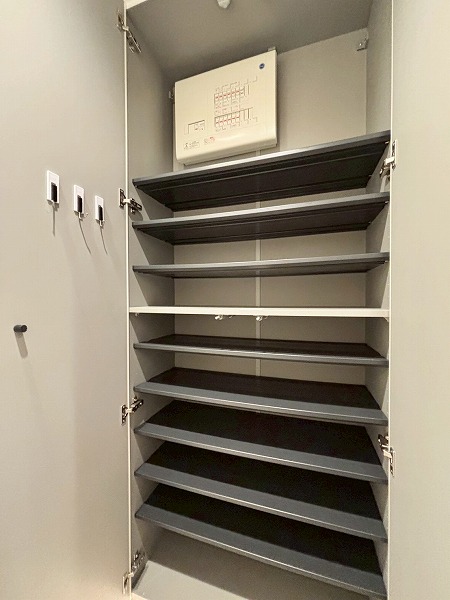 ドアを開けると人感センサー付きのライトがパッと照らしてくれます。スイッチを探す手間が省けるので、両手が塞がっている際などに便利ですね。シューズボックスだけでなく、廊下に大きな収納をご用意。棚板の位置を動かせるので、掃除機やフローリングワイパーなどの大きなアイテムも保管できます。