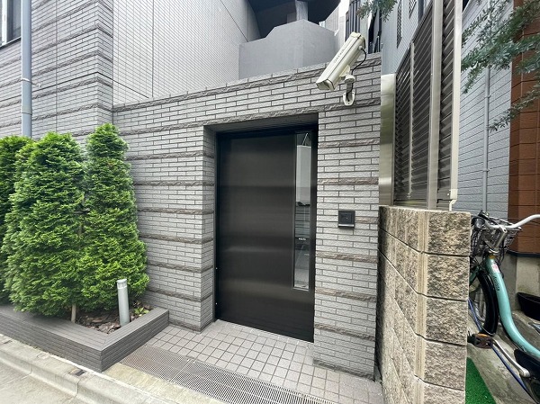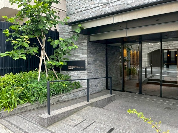 上質な雰囲気をまとったアプローチを進み、エントランスへ。入り口にはスロープが設けられており、ベビーカーや荷物の多い日でも無理なく行き来できる配慮が感じられました。