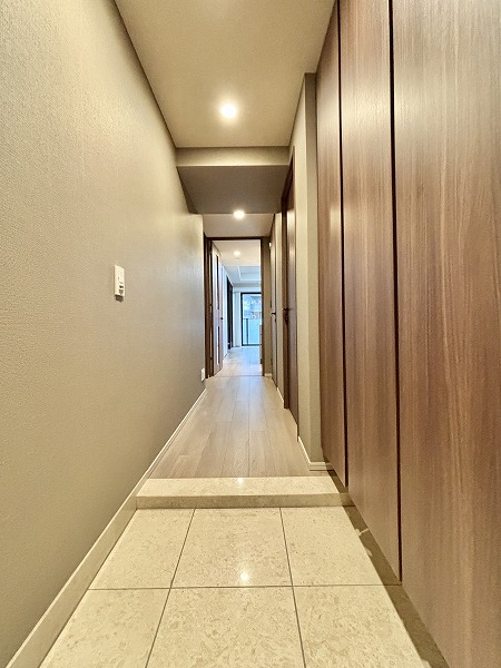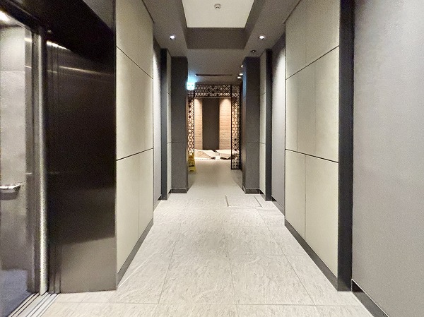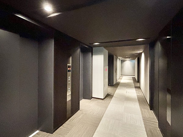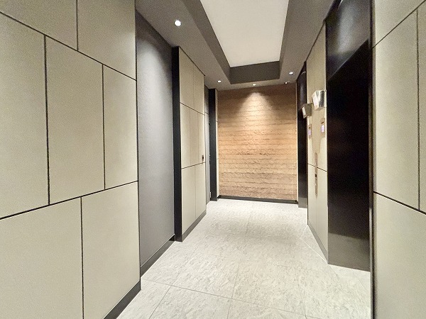 タイルと木目の組み合わせが美しいエレベーターホール。エレベーターは複数基完備されていました。総戸数が100戸を越えますが、これなら待ち時間は少なく済みそうですね。
