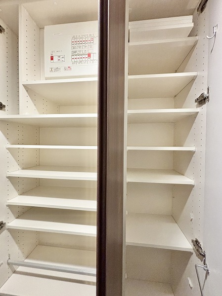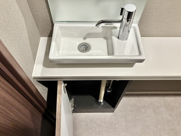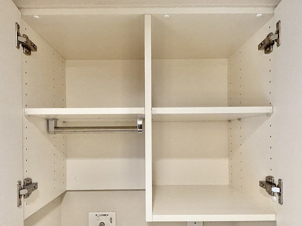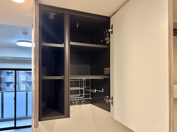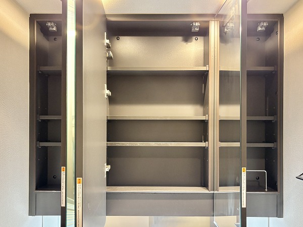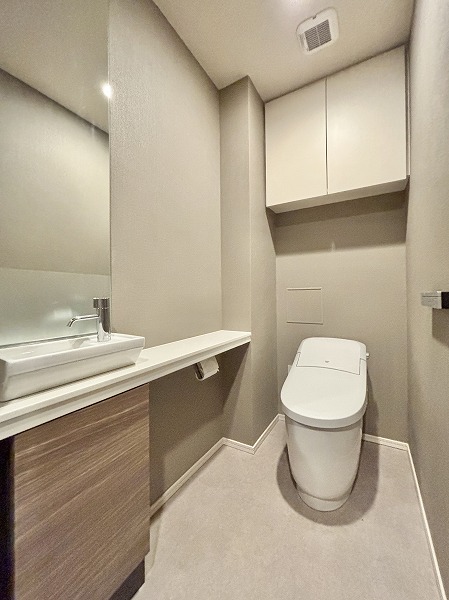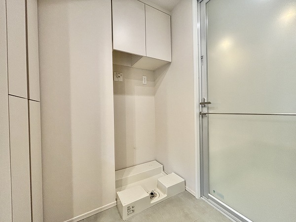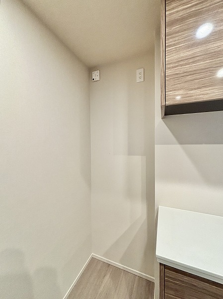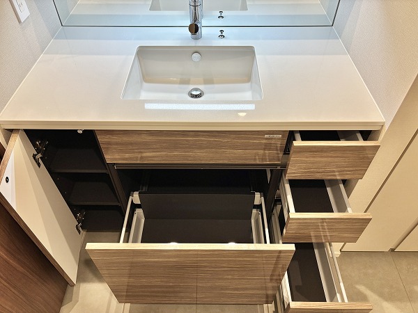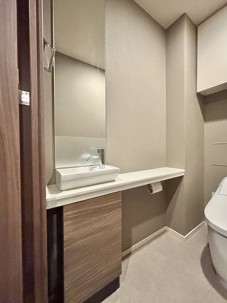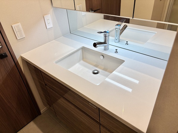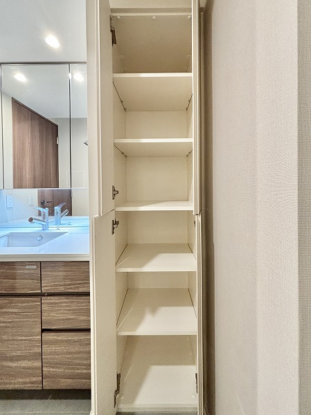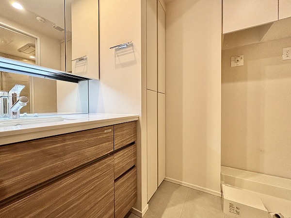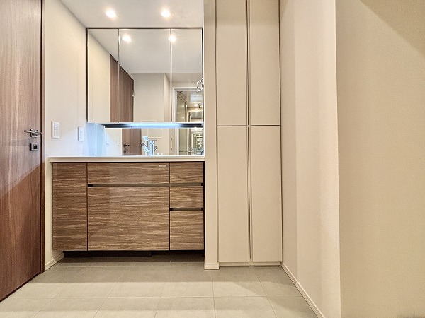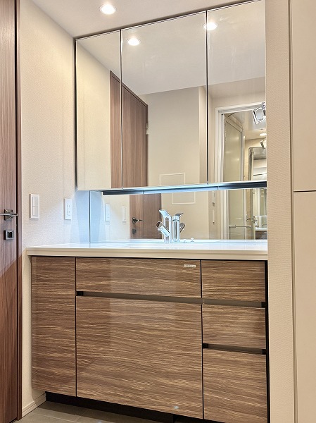 パウダールームは玄関右手にあり、ご帰宅後すぐに手を洗うことができます。白とブラウンを基調とした明るい空間。洗面化粧台には天井まで届く大きなミラーが。これなら背の高い方も屈まずにお顔や髪型をチェック可能です。