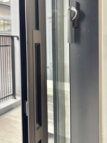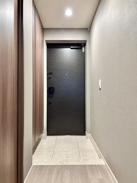 奥行きのあるアプローチを進むと、大きな柱が目を惹くエントランスが。オートロックは柱の裏に隠されていました。「LIFE EYE'sセコムシステム」を搭載しており、安心してお過ごしいただけますよ。