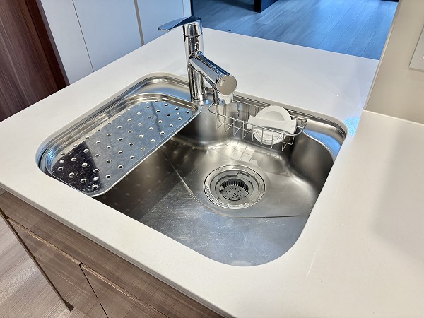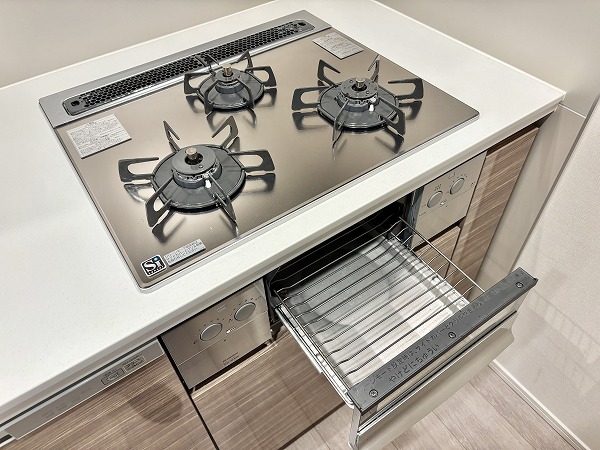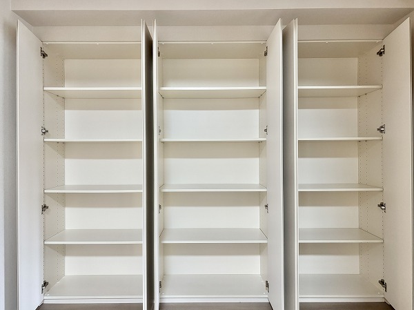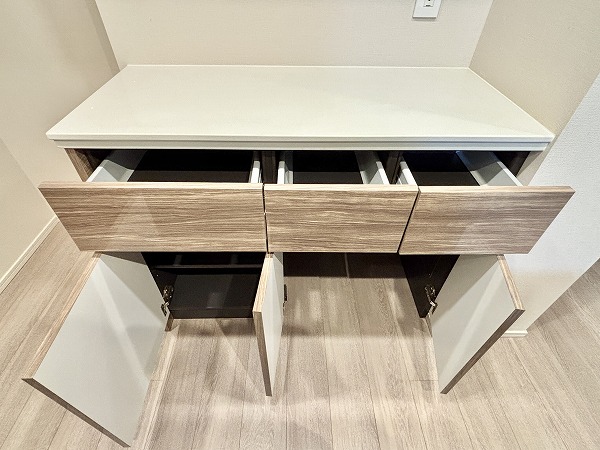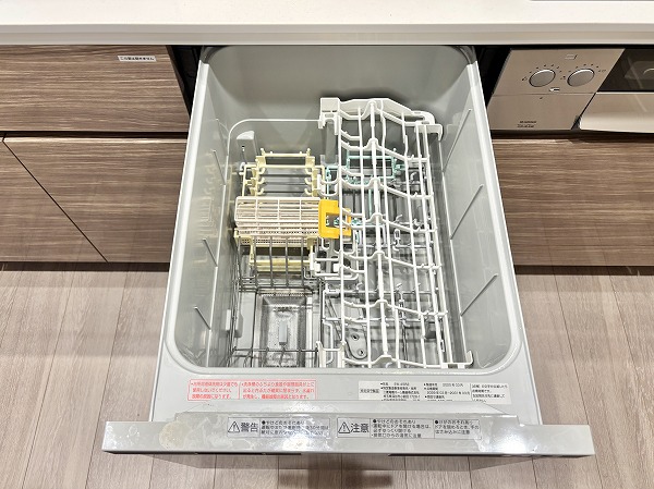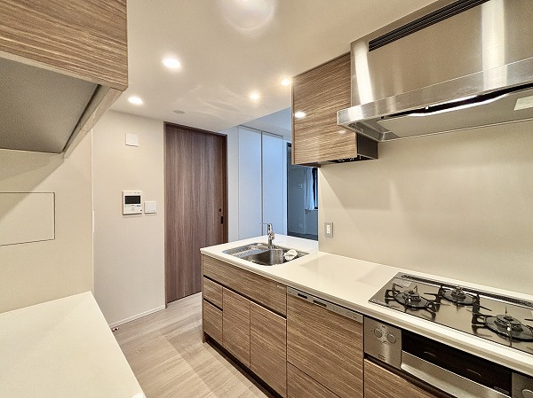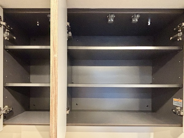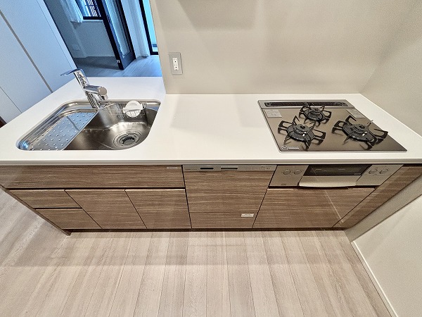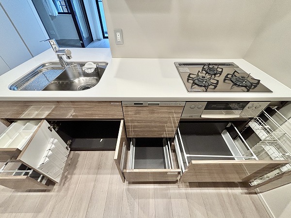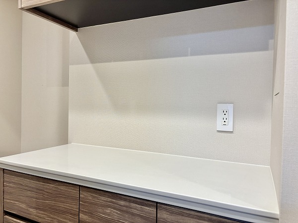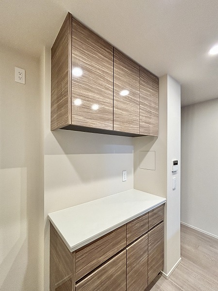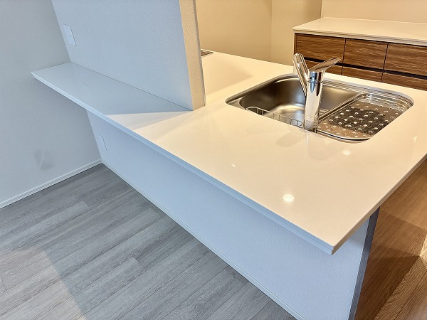 およそ2.9帖のゆったりしたキッチンなら、ご家族と一緒に作業することができますね。ワークトップが広く、下ごしらえや盛り付けがしやすそう。キッチン前面にカウンターがあり、配膳も楽に行えます。大きなカップボードが備わっているので、食器やカトラリーなども保管しやすいですね!