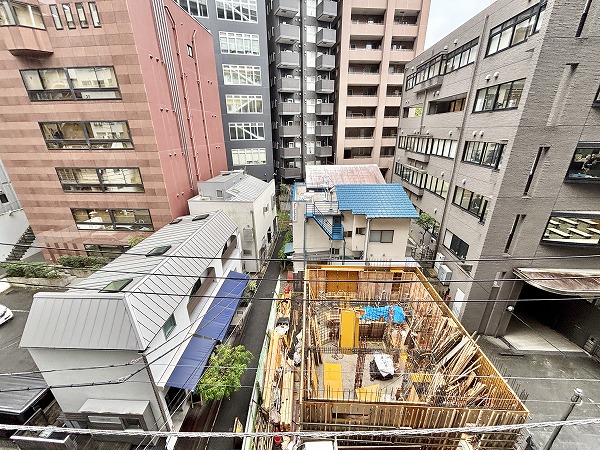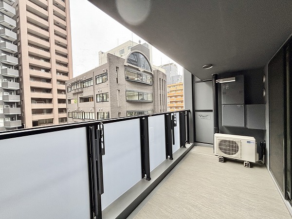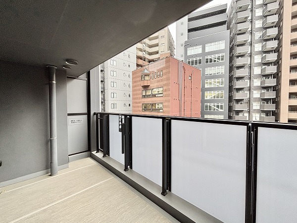 南東向きのバルコニーは11.04㎡の広々空間。手すりのパネルが半透明なので、干している洗濯物が外から見えにくくプライバシーが守られます。ちょうど今目の前で工事をしているので、そちらの高さ次第ではすこし日当たりに変化があるかもしれません。
