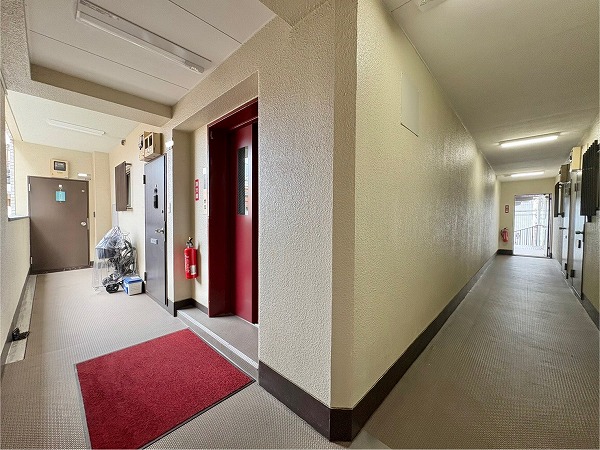 エントランスは明るい白を基調にまとめられ、足元のレッドカーペットが印象的。華やかさと実用性を兼ね備えた空間で、雨の日も快適に出入りができます。シンプルながらも品のあるデザインが魅力的。