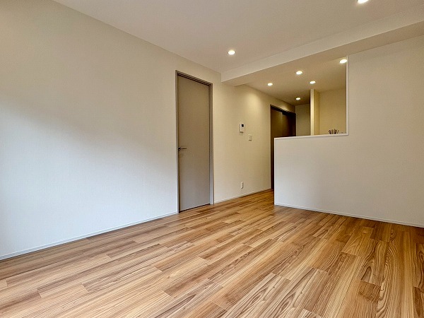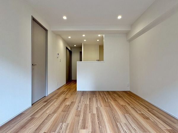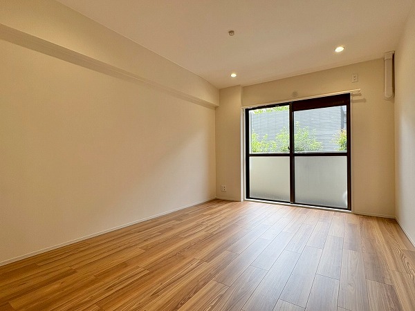 南向きの大きな窓から自然光がたっぷりと降り注ぐメインルーム。明るくシンプルな内装は、どんな家具とも相性抜群です。柔らかな光とダウンライトの組み合わせが、心地よい立体感を演出。昼も夜も快適に過ごせる空間です☀
