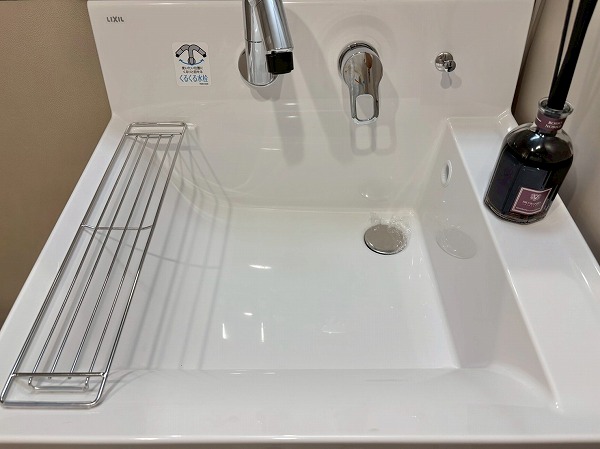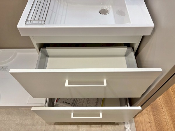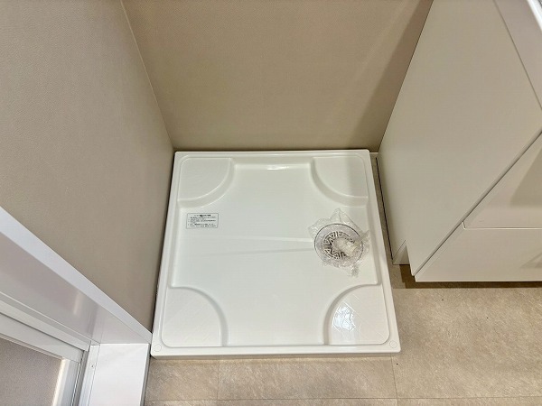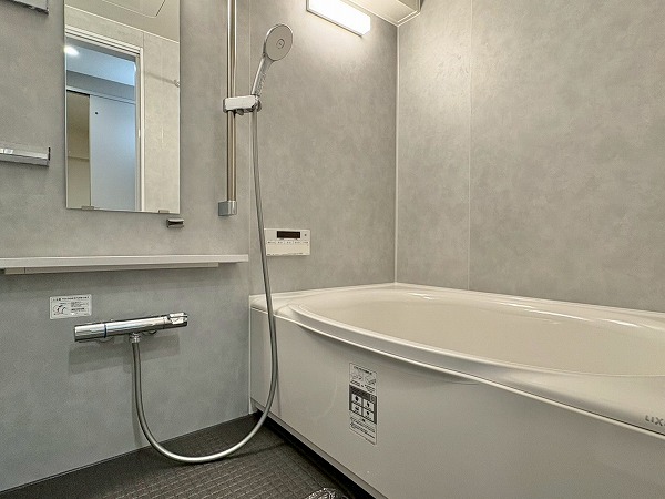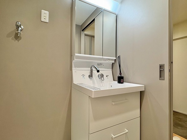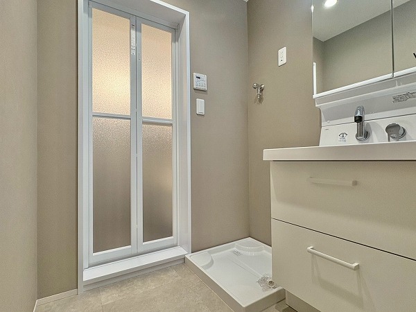 玄関廊下からアクセスできるサニタリースペースは、生活動線がスムーズ◎バスルームは優しいグレートーンで統一され、ゆったりくつろげる癒しの空間。家族みんなが快適に使える機能が充実しています。