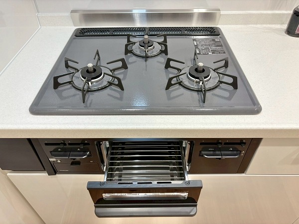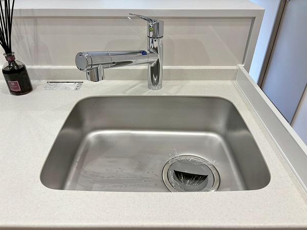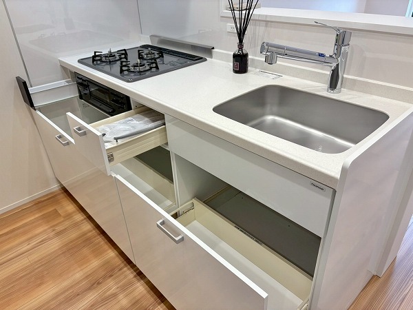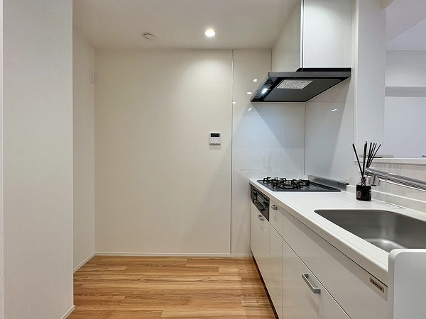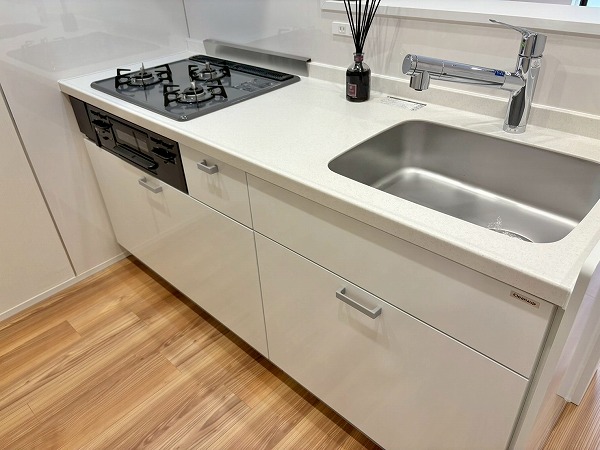 シンプルで洗練された白いシステムキッチン。背面にゆとりがある設計で、カップボードを設置することが可能です。新しい設備が揃っているので、お料理時間がより楽しくなりそう♪キッチンに立つたびに気分が上がる空間です。