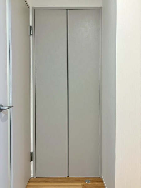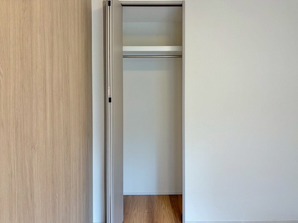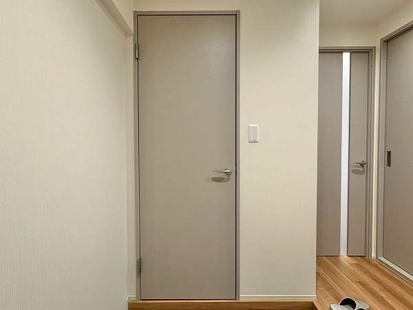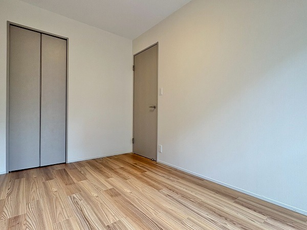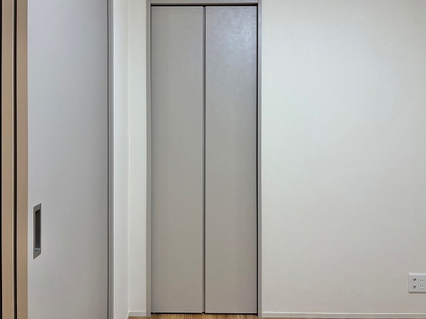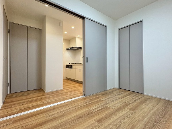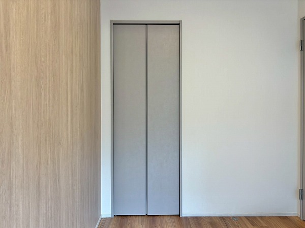 グレーの引き戸で仕切られた洋室は開ければ広がり、閉めれば落ち着きのあるプライベート空間に様変わり。窓がなくてもドアを開けることで開放感をプラスできます。シンプルで使い勝手の良い一部屋です。
