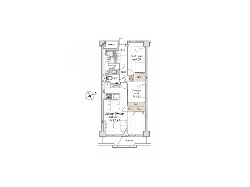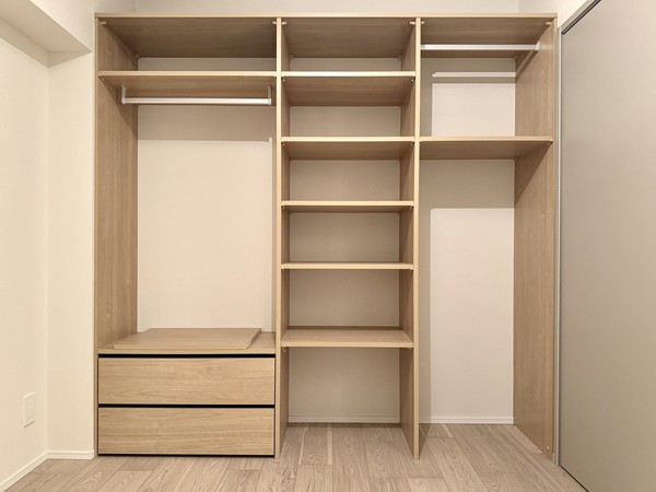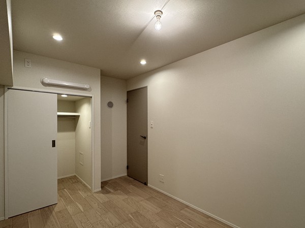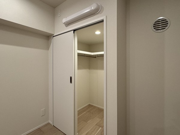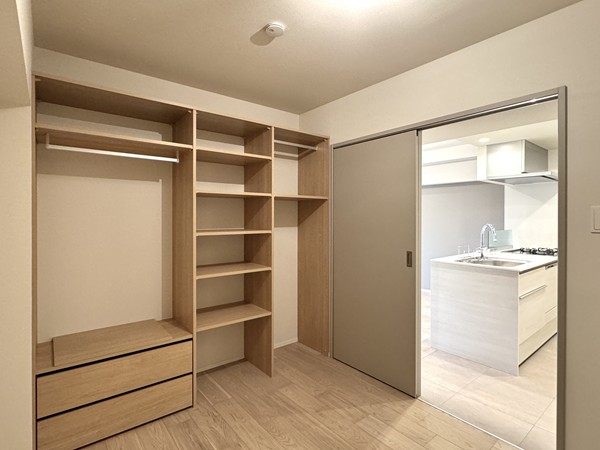 約6.0帖の洋室は、廊下に独立したプライベートルーム。主寝室にふさわしい落ち着きがあり、暮らしの中心にそっと寄り添うような佇まいです。奥にはゆとりあるウォークインクローゼットを完備。季節の衣類やお気に入りのバッグ、大切にしている小物まで、美しく整えて収められる心強い存在です◎