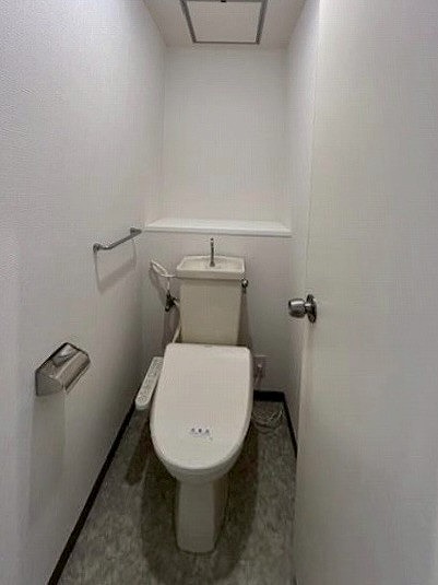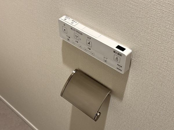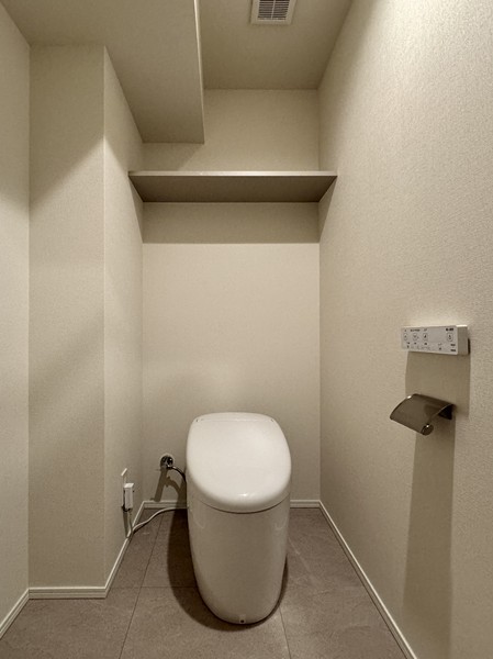 トイレはすっきりとしたホワイトを基調に整えられ、清々しい明るさが広がる空間。背面にはスリムなカウンターがさりげなく備わり、フレグランスを置いたり、季節の小物で彩ったりと自分らしい一角を造ることができますよ♥日用品をまとめて置ける実用性もあり、見た目の清潔感を保ちながら使い勝手も損なわない、気の利いたアクセントになっています。