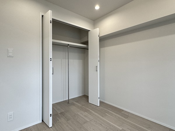 廊下に独立した洋室は2面採光を贅沢に取り込み、のびやかな明るさが心地よい一室。広さにも余裕があり、大きなベッドを配置してもまだゆったりと動線が保てる印象。クローゼットも備わっているため、衣類や日用品をすっきりしまえて、より一層の広さを感じられるのもポイントですね。