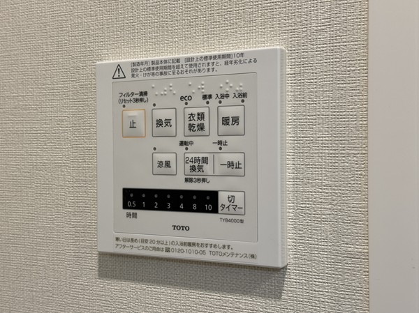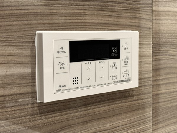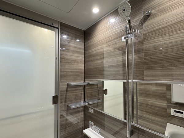 バスルームは、木目の鏡面パネルが艶やかに光を拾い、まるで上質なホテルのような穏やかなぬくもりを感じる空間。追い焚き機能を備えているので、好きな温度でゆっくり湯船に浸かれる贅沢さも魅力。浴室乾燥機付きで、雨の日のお洗濯も頼もしくサポートしてくれますよ。