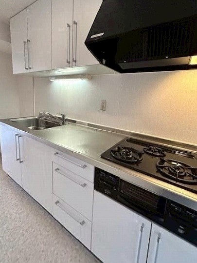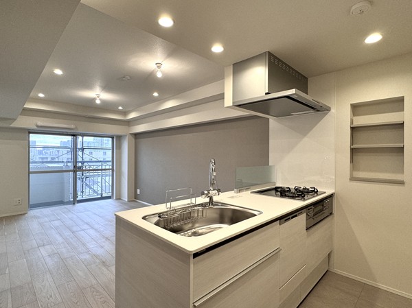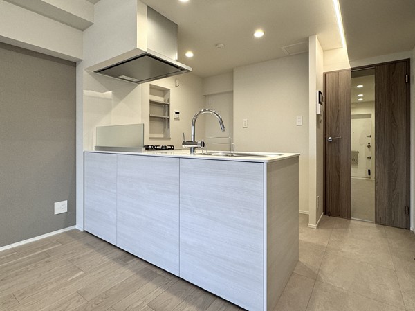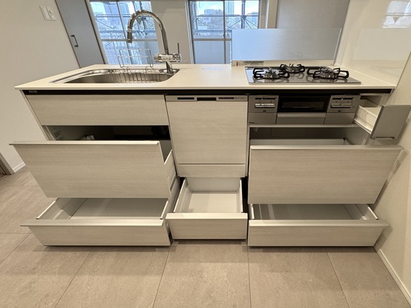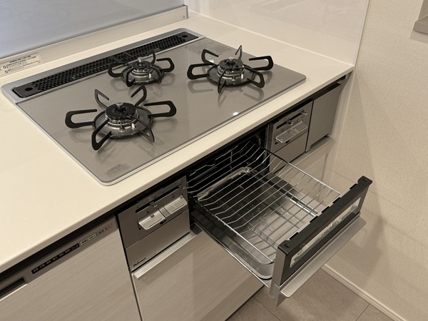 キッチンは使い勝手の良い独立タイプ。程よく生活感を隠しながら調理に集中できる、料理好きには嬉しいレイアウトです。グリル付き3口コンロを備え、同時調理もスムーズ。平日の時短ごはんから週末のちょっと特別なメニューまで、自然と“キッチンに立つのが楽しみになる”環境が整っていますよ◎